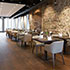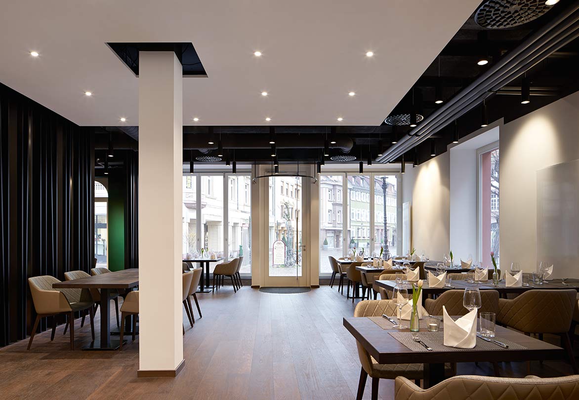 Das Restaurant öffnet sich heute mit großzügigen Fenstertüren zum Markplatz. Dort liegende Nebenräume wurden entfernt, der Gästebereich dadurch maximal vergrößert. Ebenso wurde der Blickkontakt zur „Alb“ ermöglicht, sodass der Gastraum heute komplett durchbindet.