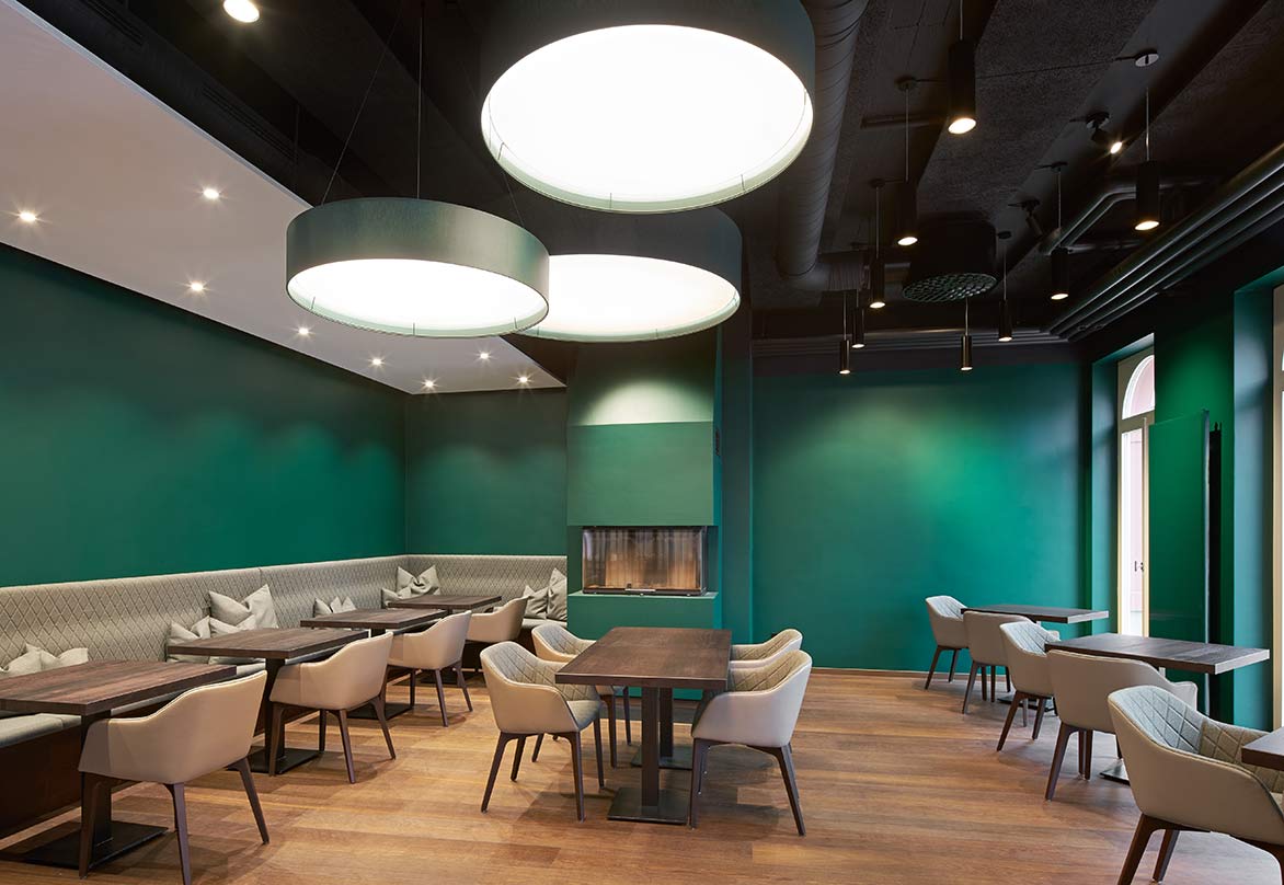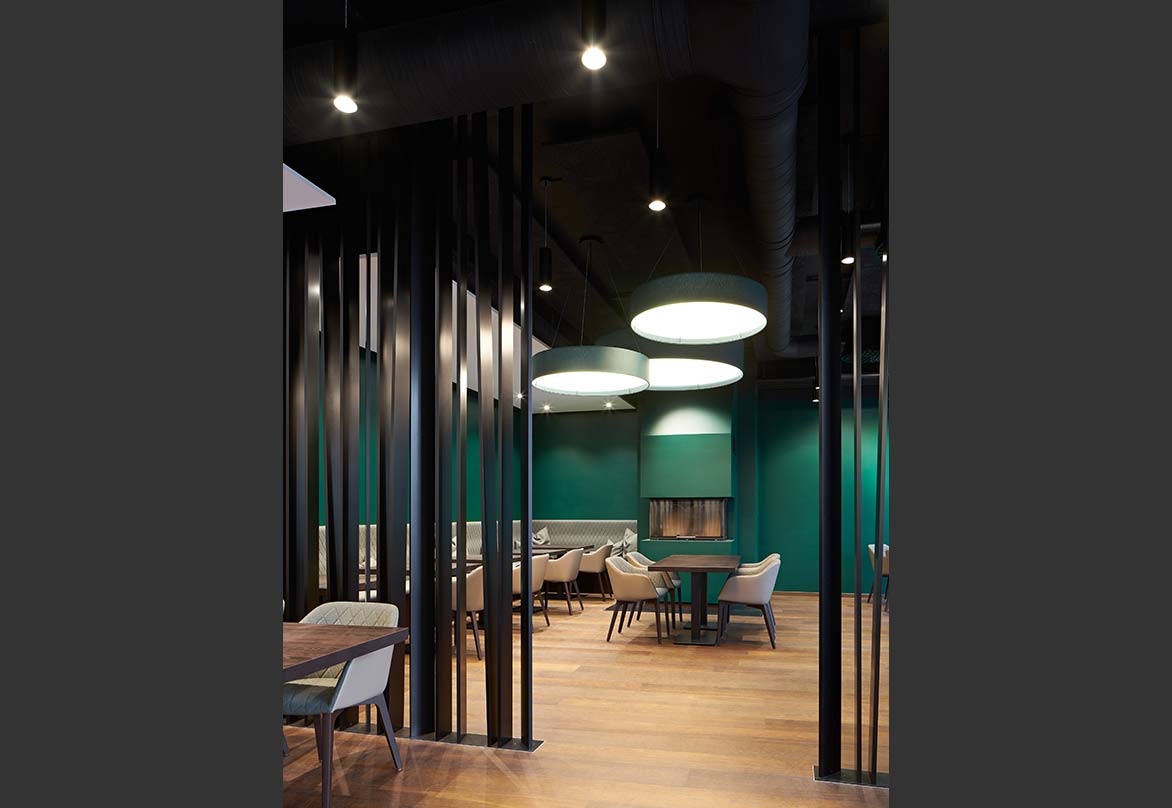 Um dem Gastronomen verschiedene Raummodelle anbieten zu können, entstand das durch einen Paravent separierte grüne Kaminzimmer, das sich vom großen Gastraum atmosphärisch unterscheidet. Insgesamt verfügen die „Ratsstuben“ nun über ein differenziertes Raumangebot, sodass vom Einzelgast, der größeren Gruppe bis zur geschlossenen Gesellschaft eine vielfältige Nutzung für den Betreiber möglich ist.