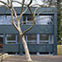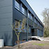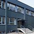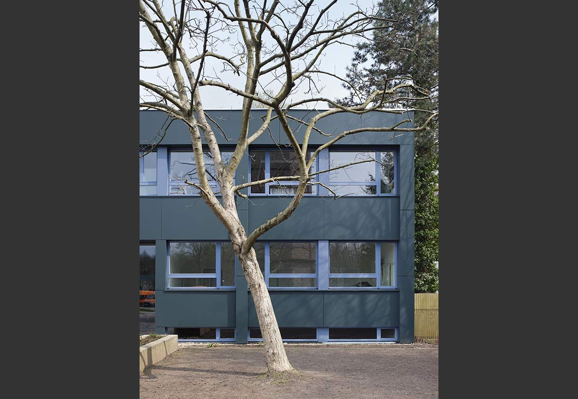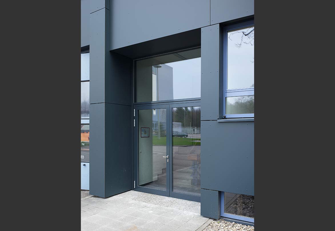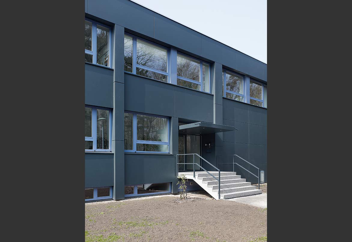 Unsere Arbeit lag darin, eine sowohl architektonisch als auch energetisch zeitgemäße Sanierung der Fenster und Fassaden durchzuführen. Gestalterisch war es uns wichtig, die nüchterne und funktionale Architektur bestehen zu lassen und nur sehr zurückhaltend einzugreifen. Die Fenster- und Jalousienanlagen wurden benutzergerecht entworfen, die Eingangselemente repräsentativ gestaltet. Die Waschbetonplatten und Betonpfeiler konnten gedämmt werden, die wartungsfreien Fassadenplatten wurden hinterlüftet davor gehängt.