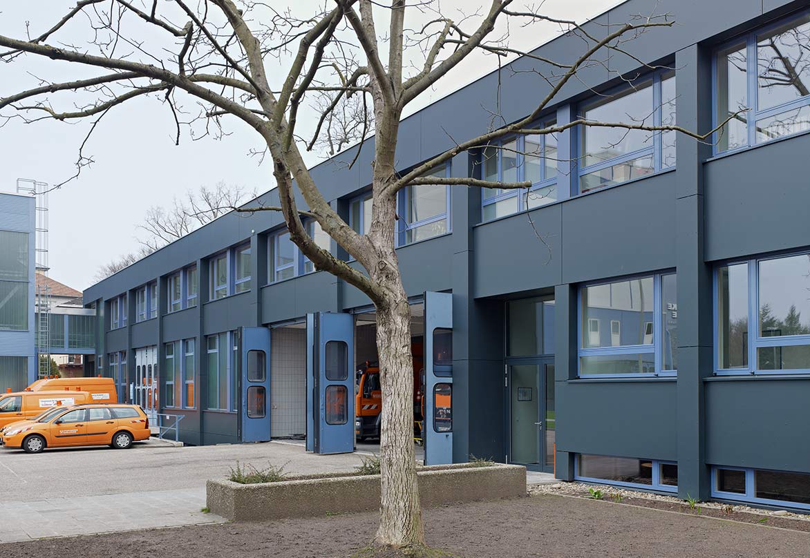 Das Betriebsgebäude der Stadtwerke Karlsruhe wurde in den 60er Jahren erbaut und beherbergt heute die Abteilung Straßenbeleuchtung mit Lager-, Werkstatt-, Schulungs- und Büroflächen. Als bisher völlig ungedämmter Waschbetonbau entsprach er in keinster Weise den heutigen Wärmeschutzanforderungen. Die Mitarbeiter beklagten sich über Hitze im Sommer, Kälte im Winter, schlecht bedienbare und zugige Fensteranlagen und einen nur bedingt einsetzbaren Sonnenschutz.