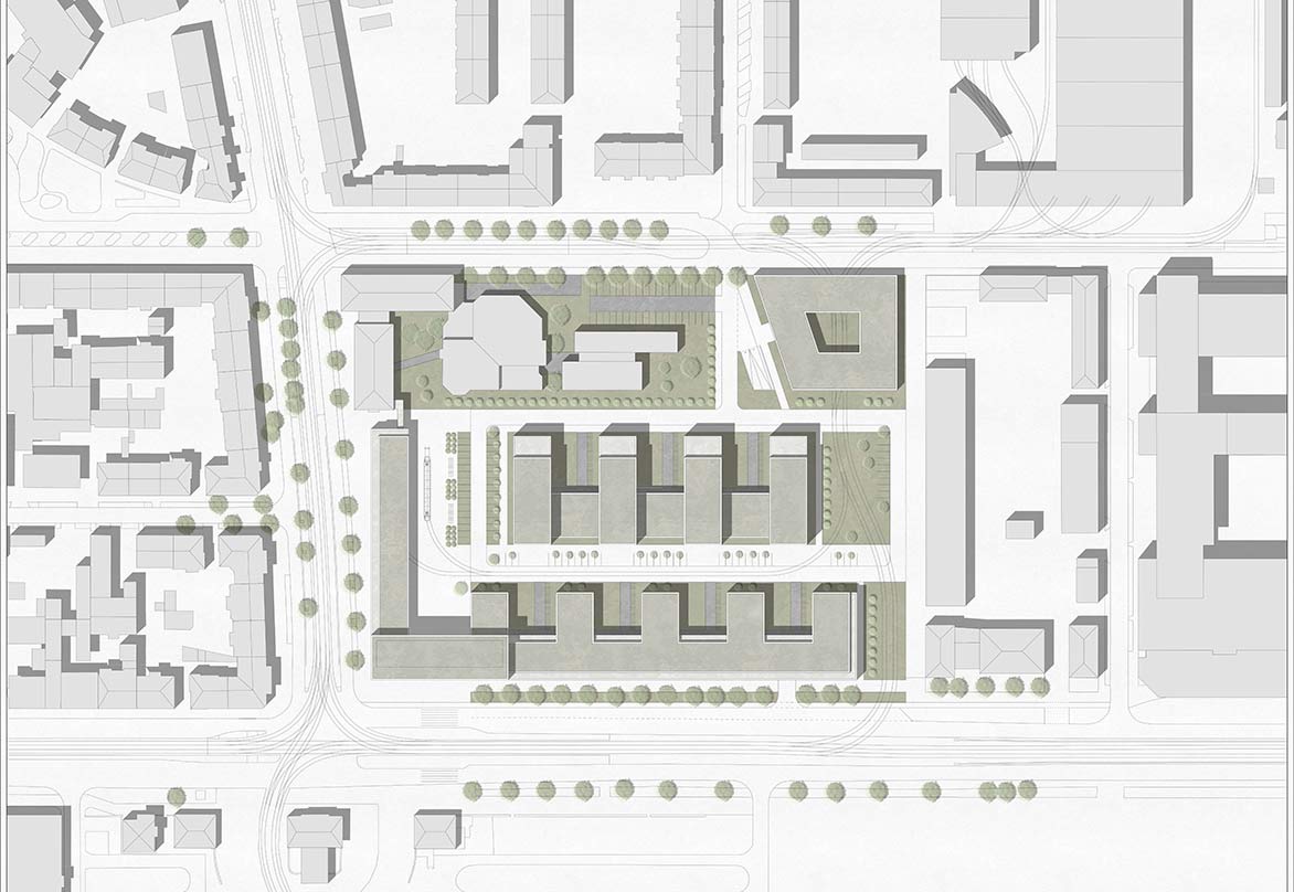 Unser Entwurf übernimmt als Stadtbaustein die Maßstäblichkeit der Gewerbebauten, andererseits die Blockrandbebauung der Oststadt.