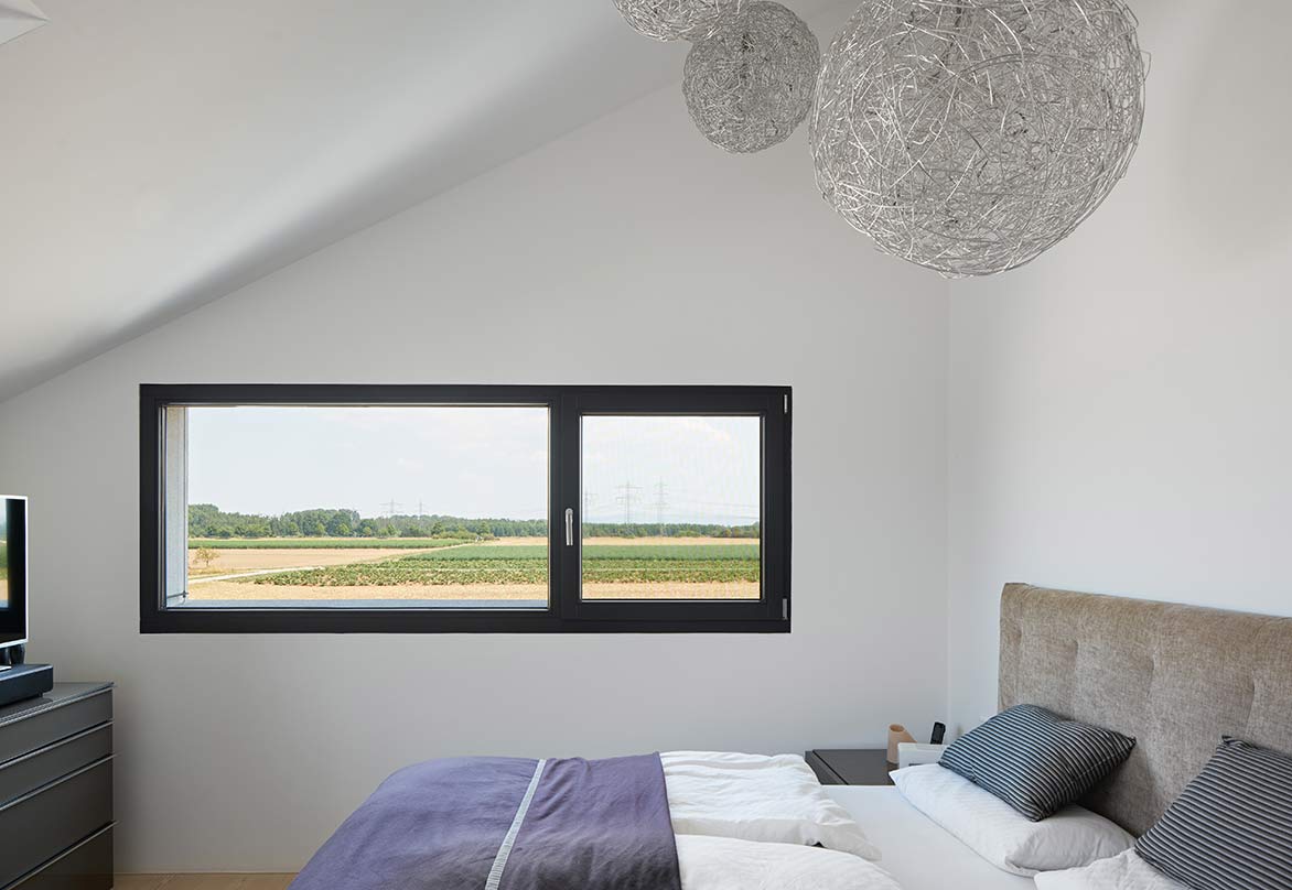 Auf der Straßenseite eher verschlossen, auf der Gartenseite großzügig zum Feldrand übereck raumhoch verglast, steht das Haus nachvollziehbar gegliedert da. Additive Elemente wie Vordach und Müllbox werden für die Feingliederung und Wegeführung in das Gesamtkonzept integriert.