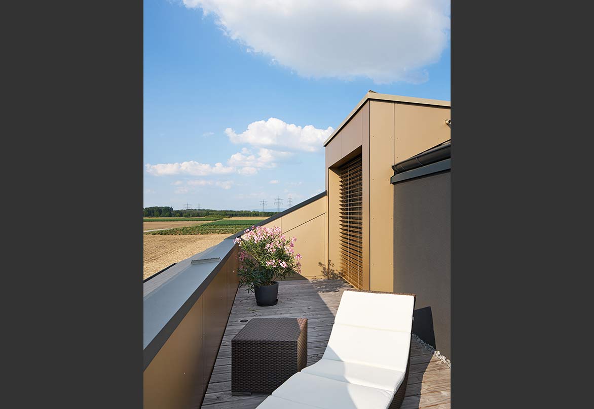 Von den gartenseitigen Dachgauben der Schlafräume gelangt man auf die sichtgeschützte, durchgehende Dachterrasse.