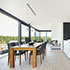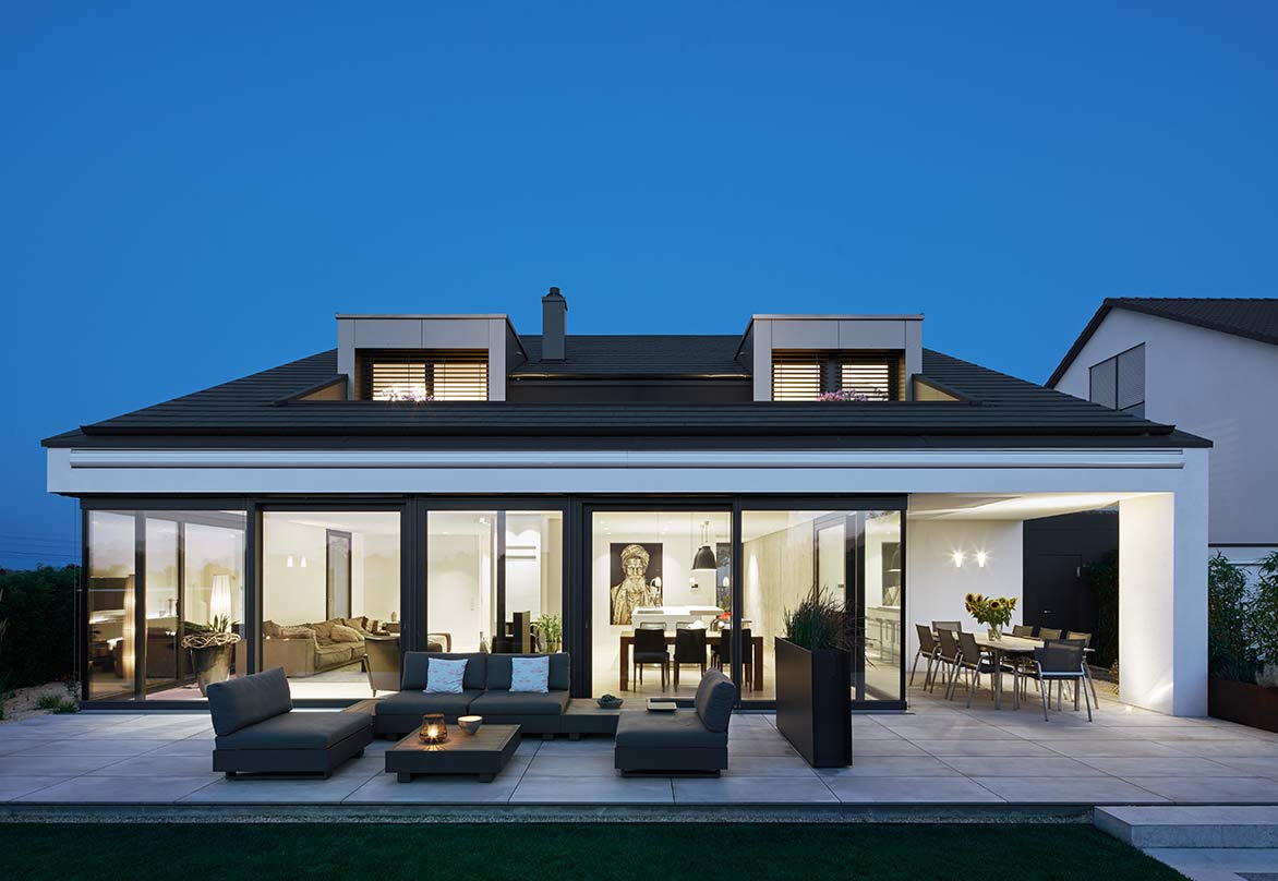 Der asymmetrische Dachquerschnitt zusammen mit der großzügigen Verglasung vermittelt vom Garten einen villenartigen Charakter, dies wird durch die ausladende Gartenterrasse mit großformatigen Platten zusätzlich unterstützt.