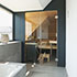 Im Innern besticht der durchlaufende Lärche-Dielenboden, der alle Bereiche zusammenzieht. Feine Möbel, hochwertige Oberflächen stehen in angenehmen Kontrast zu der roh belassenen Sichtbetonwand, die durch's Gebäude führt.