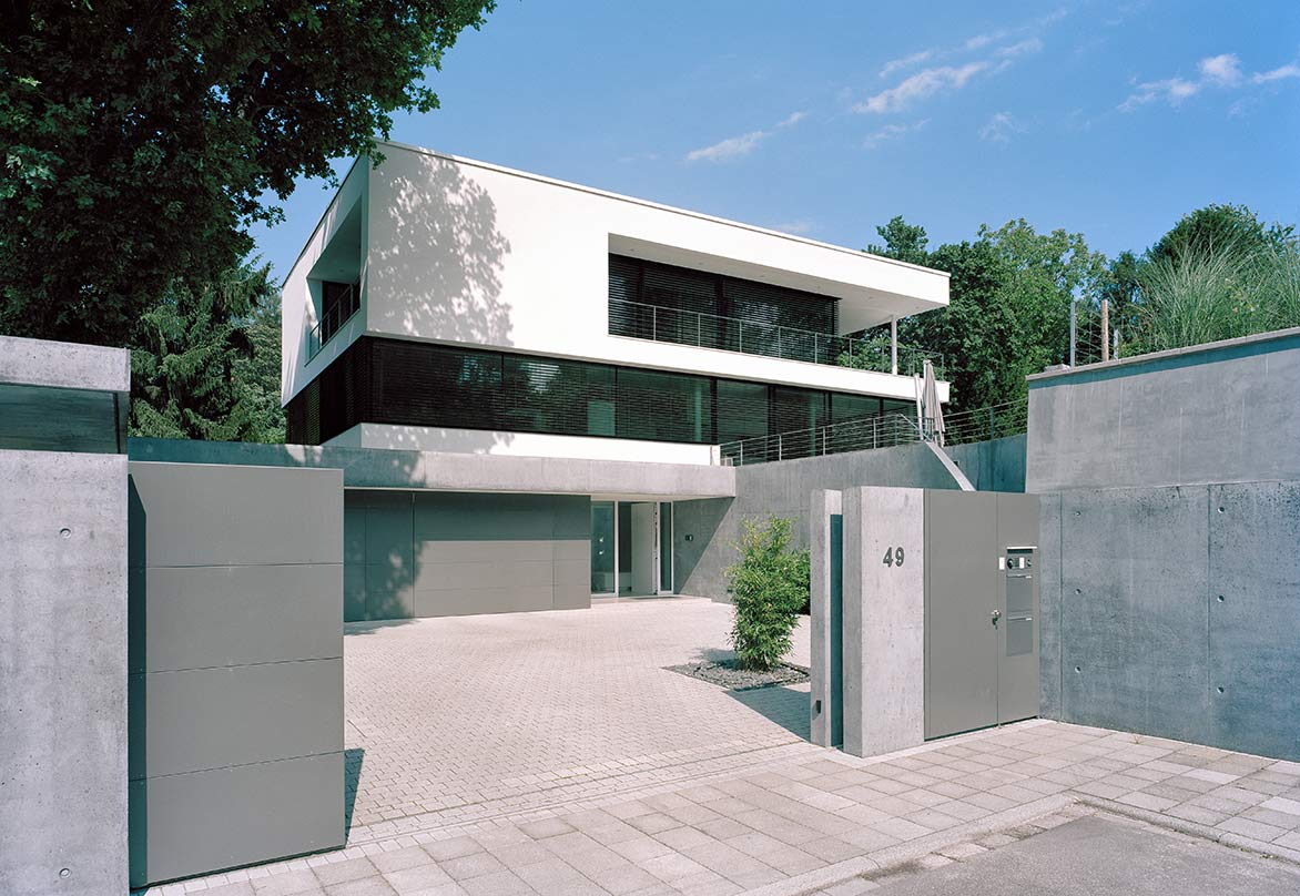 Auf dem Gelände trennt eine geschosshohe, gebogene Stützmauer aus schwarz pigmentiertem Sichtbeton das untere Straßenniveau vom oberen Gartenniveau. Der Baukörper staffelt sich über die Stützmauer hinweg den Hang hinauf.
