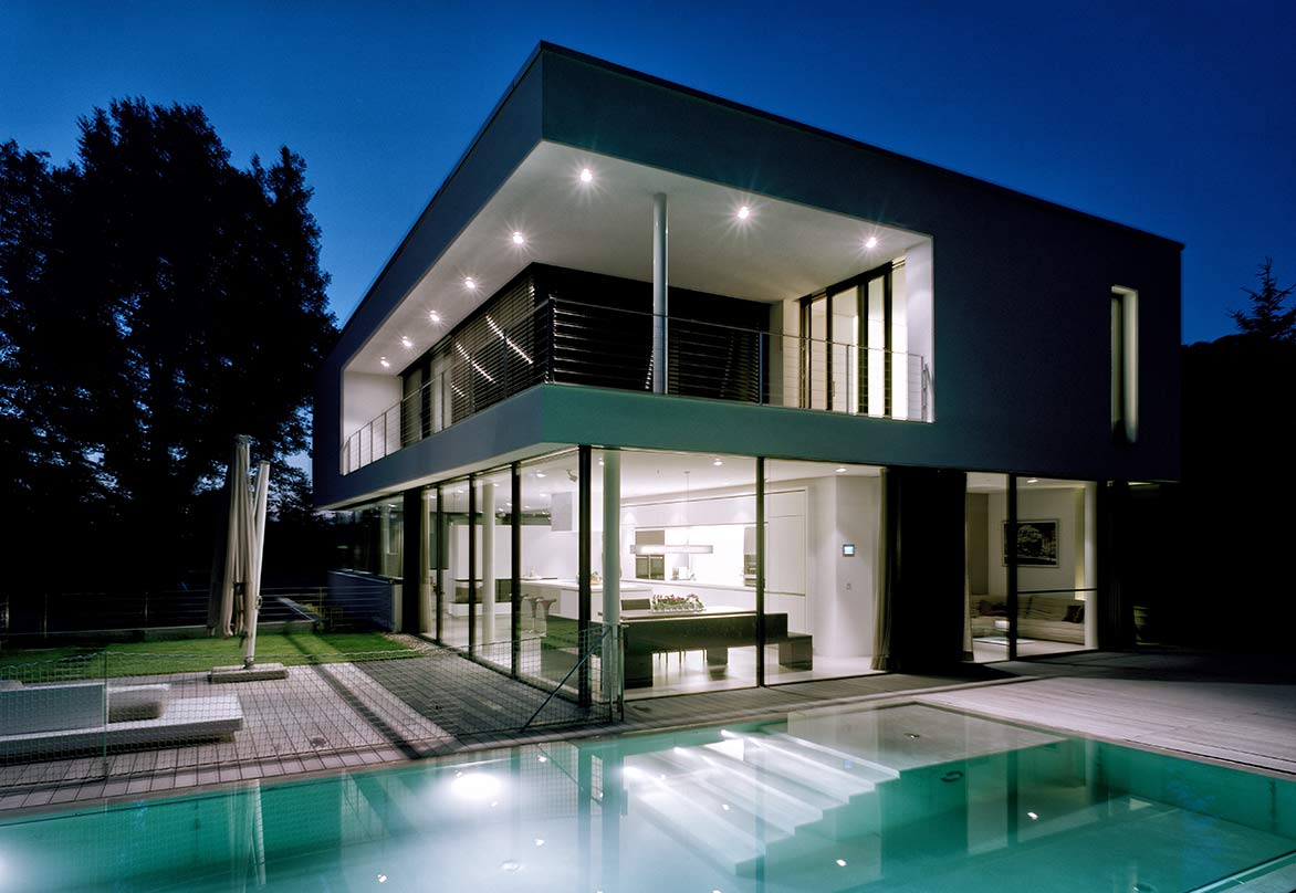 Das gesamte Wohnhaus ist mit einer intelligenten Gebäudetechnik ausgestattet. So ist unter anderem die Lichtsteuerung der Innen- und Außenraumbeleuchtung individuell auf die Bewohner abgestimmt und ermöglicht je nach Anlass, das Gebäude mit unterschiedlichen Lichtszenen zu beleben und die Beleuchtung energieoptimiert zu betreiben.
