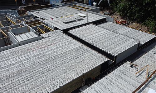 Im UG wurden bereits die Fertigteilwände gestellt. Darauf werden jetzt die Filigrandecken gelegt: