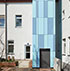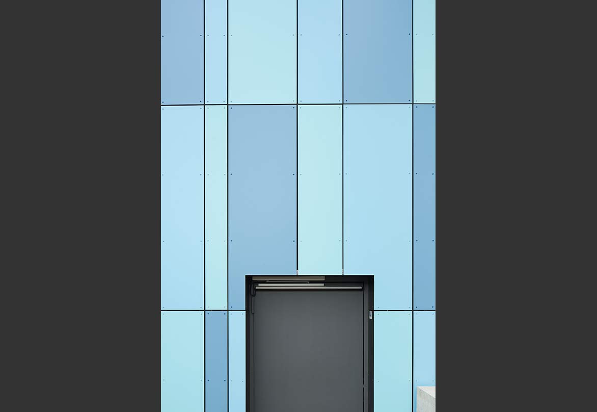 Es entstand ein frei vor der Fassade stehender Aufzugsturm, der alle Geschosse bedienen kann. Der Aufzug wurde gemäß der Firmenfarbe blau gestaltet, jedoch als Patchwork, mit unterschiedlichen Plattenformaten und dreierlei Blautönen.