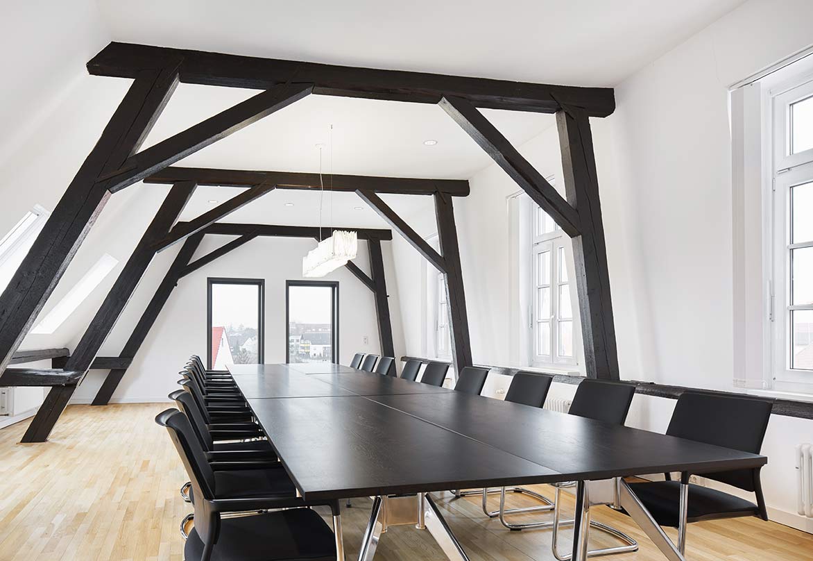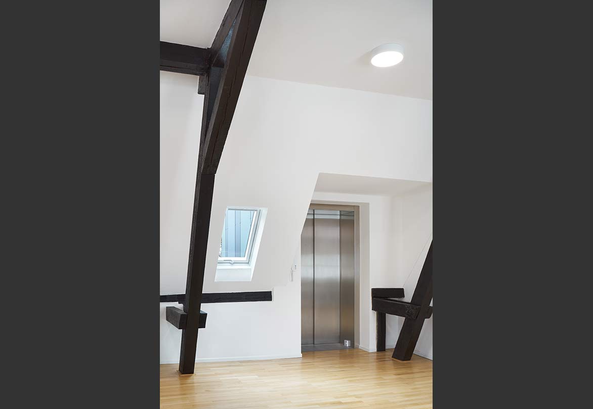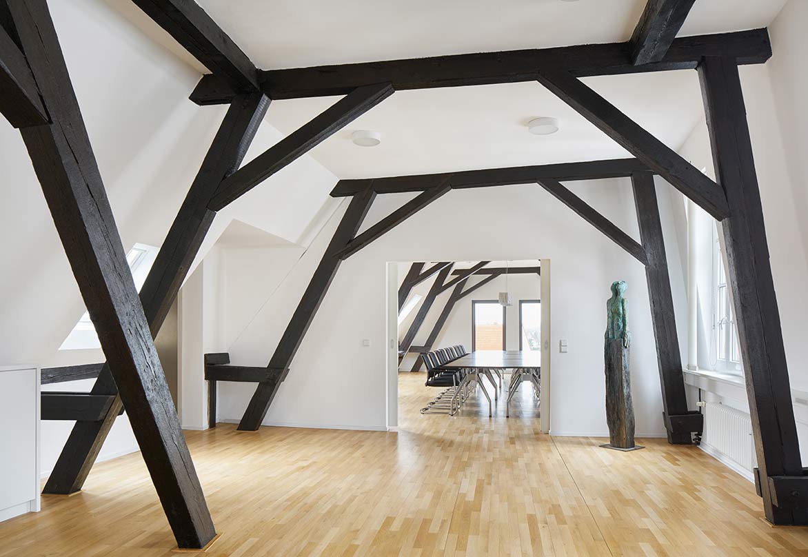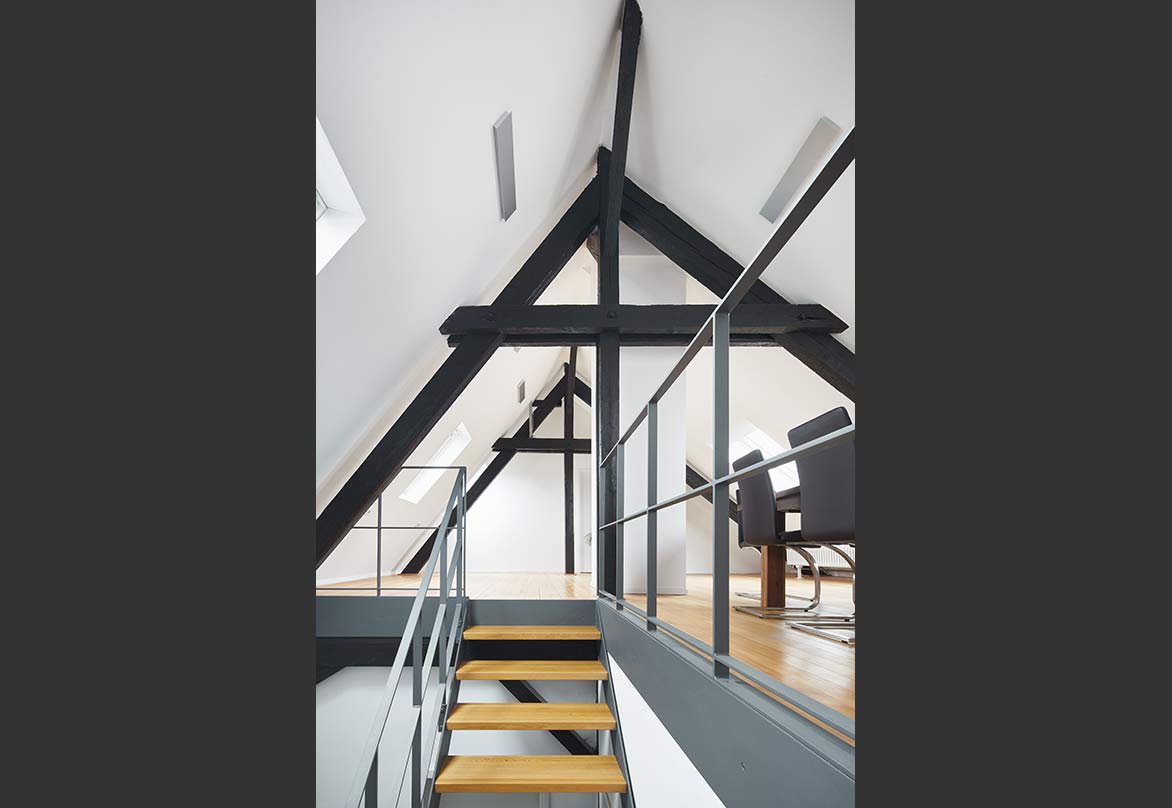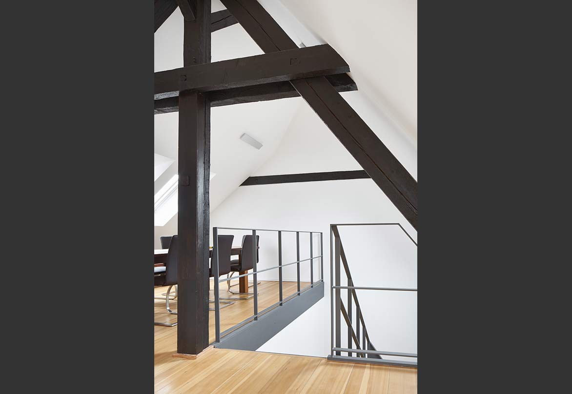 Das Dachgeschoss wurde „entrümpelt", das Holzdach-Tragwerk freigelegt und der Grundriss neu gestaltet. Ziel war es, das Dachtragwerk nicht wieder komplett in den Ausbauwänden verschwinden zu lassen, sondern ablesbar in die Innenraumgestaltung zu integrieren.