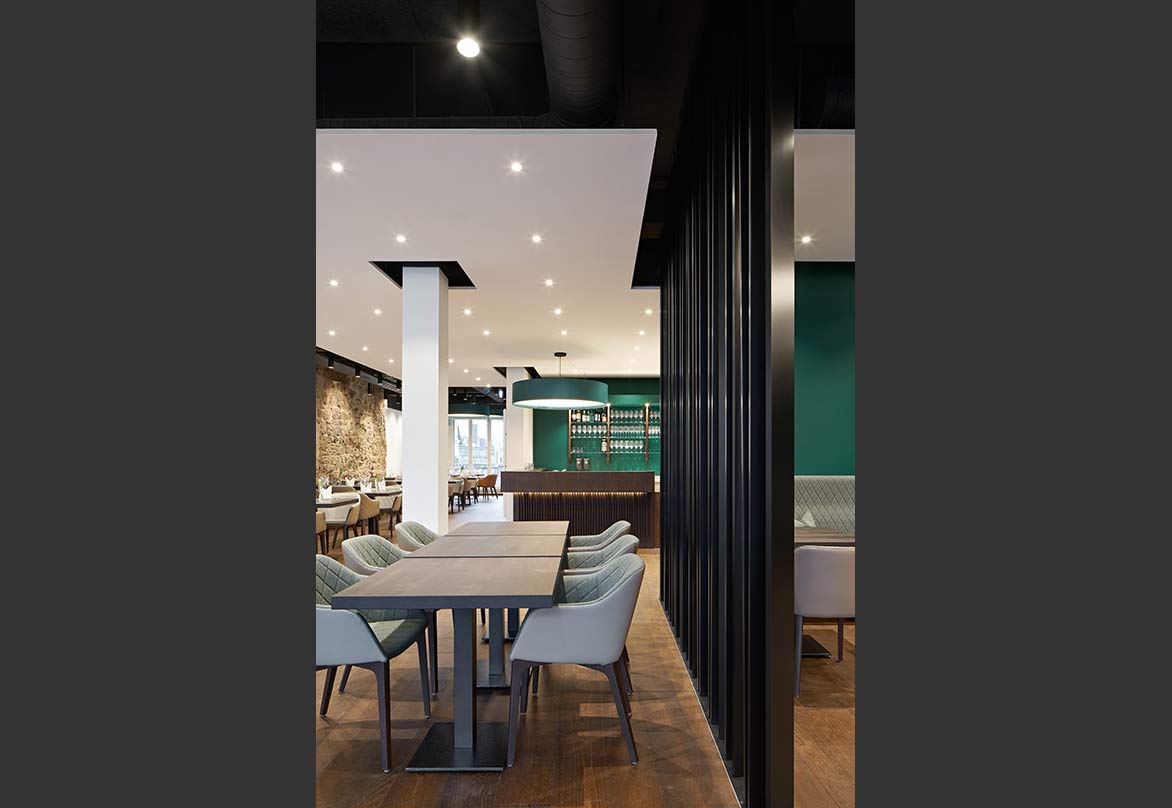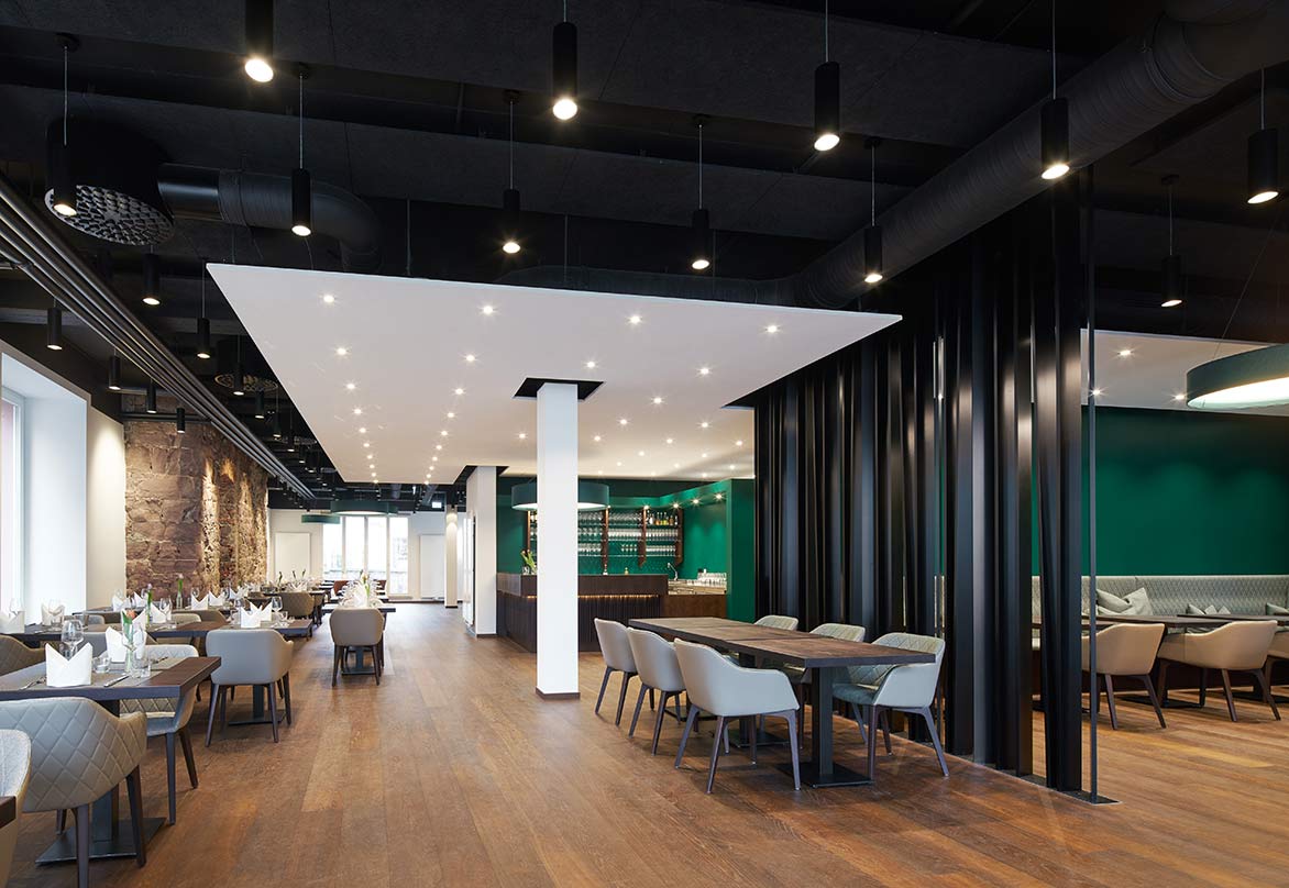Um dem Gastronomen verschiedene Raummodelle anbieten zu können, entstand das durch einen Paravent separierte grüne Kaminzimmer, das sich vom großen Gastraum atmosphärisch unterscheidet. Insgesamt verfügen die „Ratsstuben“ nun über ein differenziertes Raumangebot, sodass vom Einzelgast, der größeren Gruppe bis zur geschlossenen Gesellschaft eine vielfältige Nutzung für den Betreiber möglich ist.