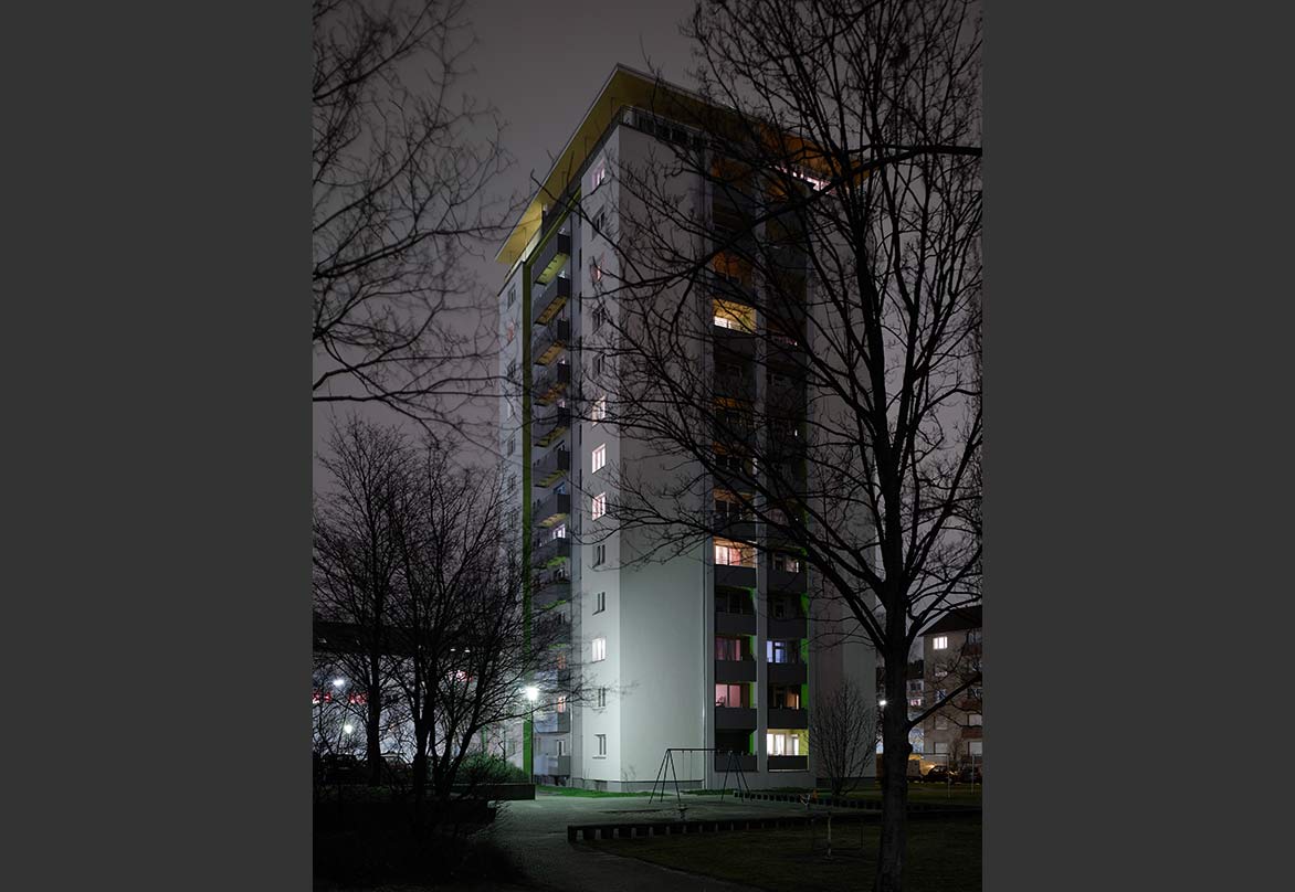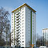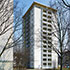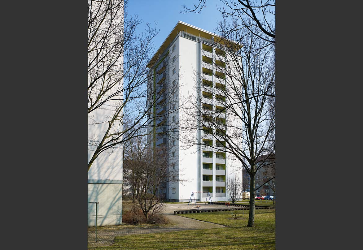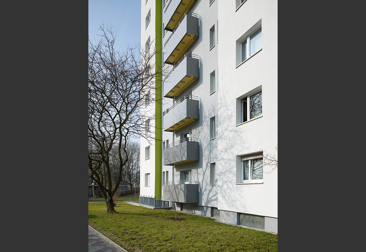 Das Hochhaus, 1959 erbaut und bis dato nur lokal instand gehalten, steht als solitäres Punkthochhaus in der Weststadt von Karlsruhe. Mit 14 Geschossen gehört es zu den höchsten Wohnhäusern der Stadt. Ein klar gegliedertes und durchaus anmutendes Gebäude mit penthouseartigem oberen Anschluss.