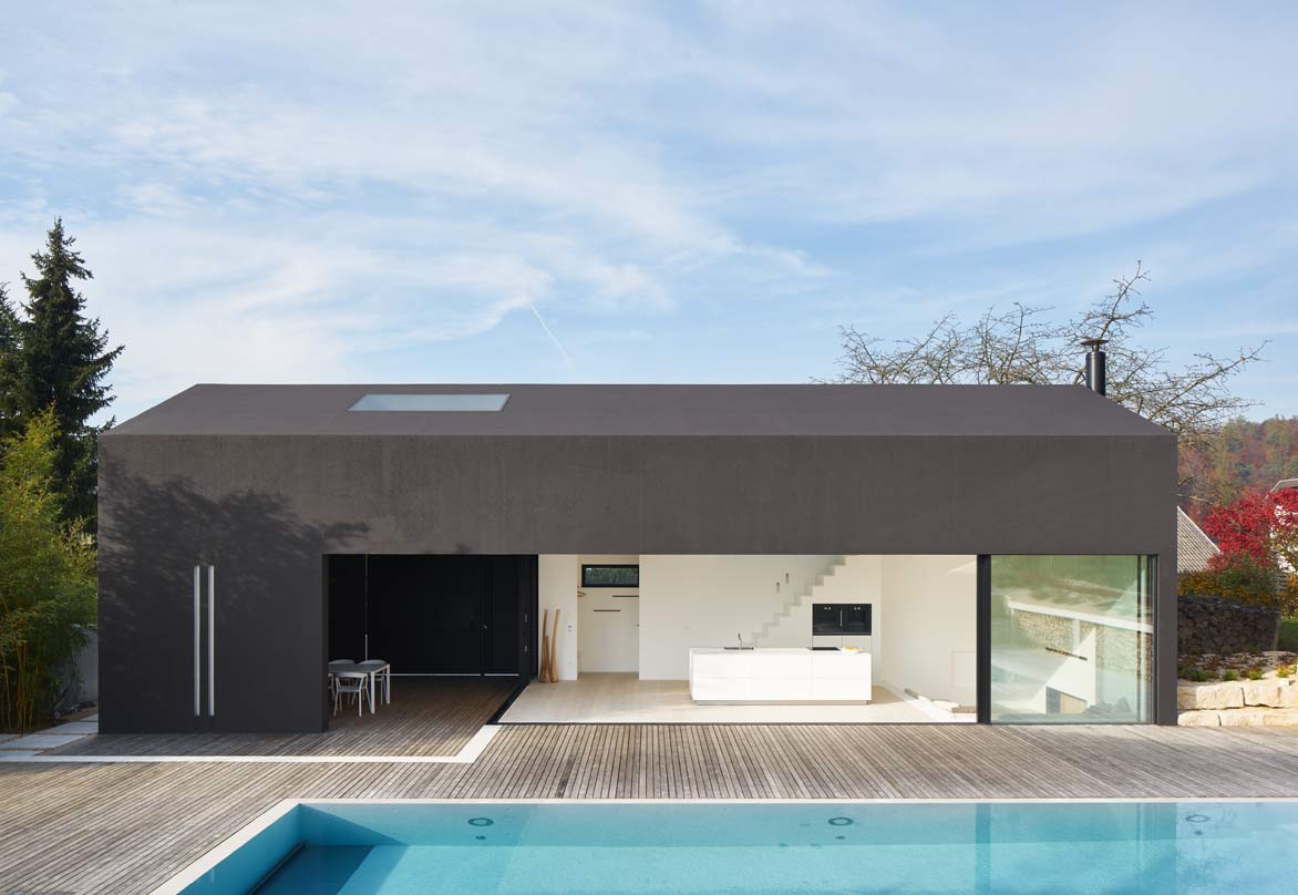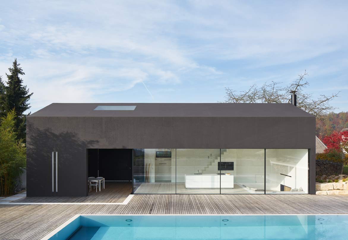 Es war klar, dass das Haus, wenn schon aus Beton, wie aus einem Guss sein sollte, d. h. nicht nur die Wände sondern auch das Dach aus sichtbarem Beton, eben komplett monolithisch, „ohne“ Fassadendetail, also ohne Dacheindeckung, Dachrinne, Fallrohre, Fensterbänke und sonstige Bauteile.