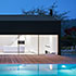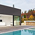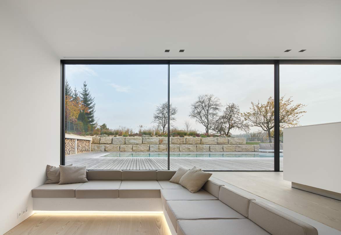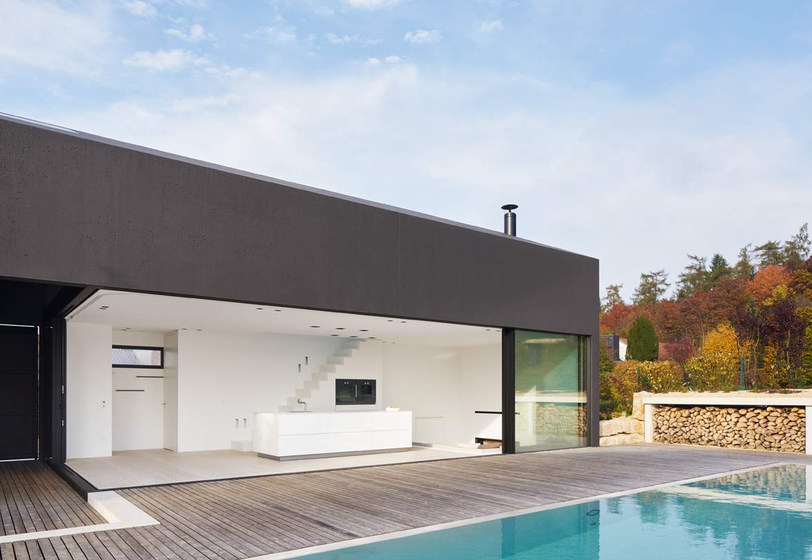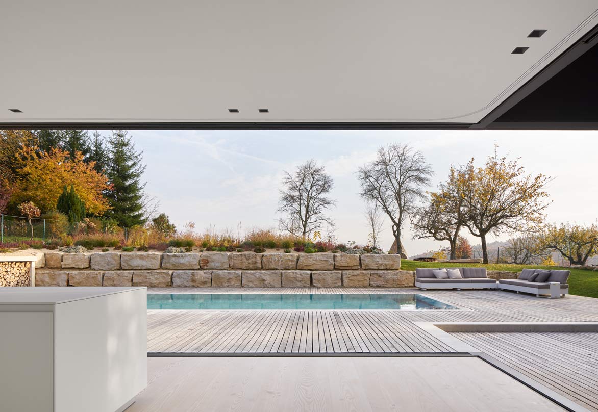 In der Holzterrasse liegt der aus Weißbeton hergestellte Sichtbeton-Swimmingpool wieder bündig in der Fläche. Durch die Ausbildung mit Überflutungsrinne ist die Wasseroberfläche gleich der der Terrassenoberfläche.