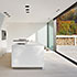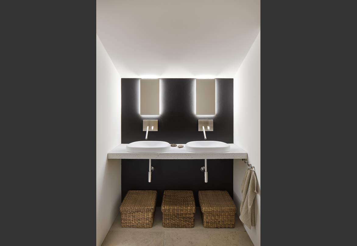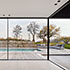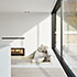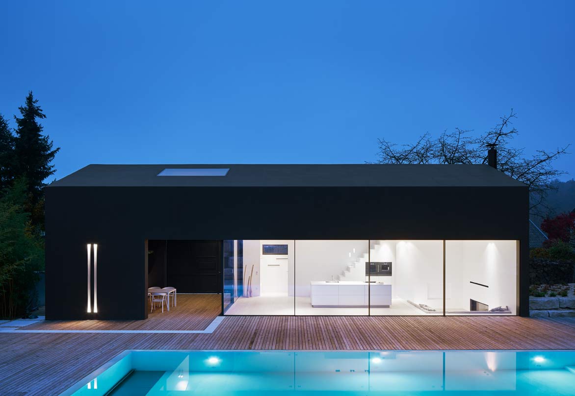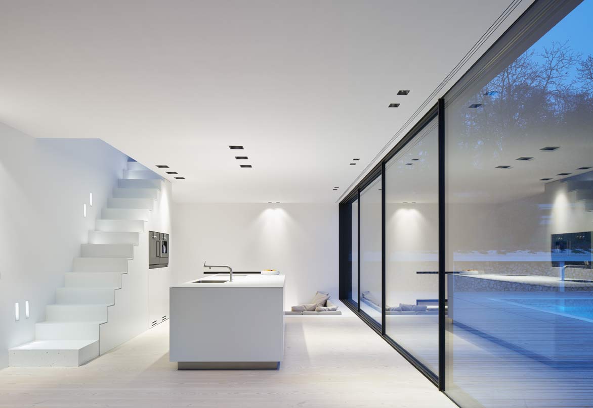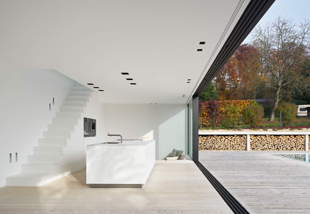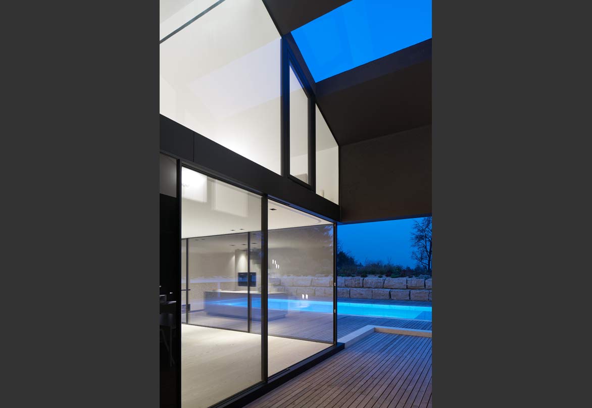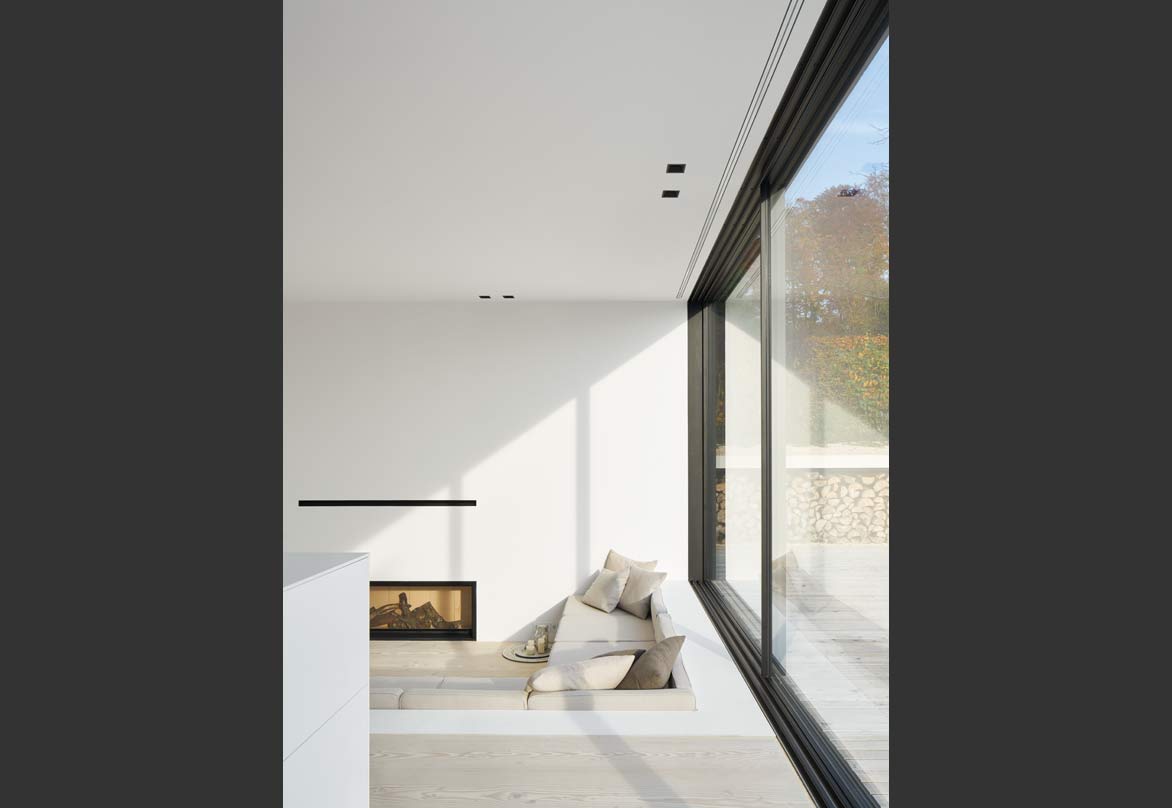 Das Haus ist zur Straße geschlossen. Man betritt es durch ein großzügiges Hoftor und befindet sich im Bereich des offenen Gebäudedurchgangs zum Garten mit Pool. Im Durchgang stehend, eröffnet sich mit einer annähernd profillosen, raumhohen Verglasung der Hauptwohnraum mit Kochen, Essen und einer abgesenkten, betonierten und mit eigens angefertigten Sitzpolstern ausgelegten Kaminlounge. Der offene Kamin ist ebenso wie der TV und die Küchengeräte wandbündig integriert.