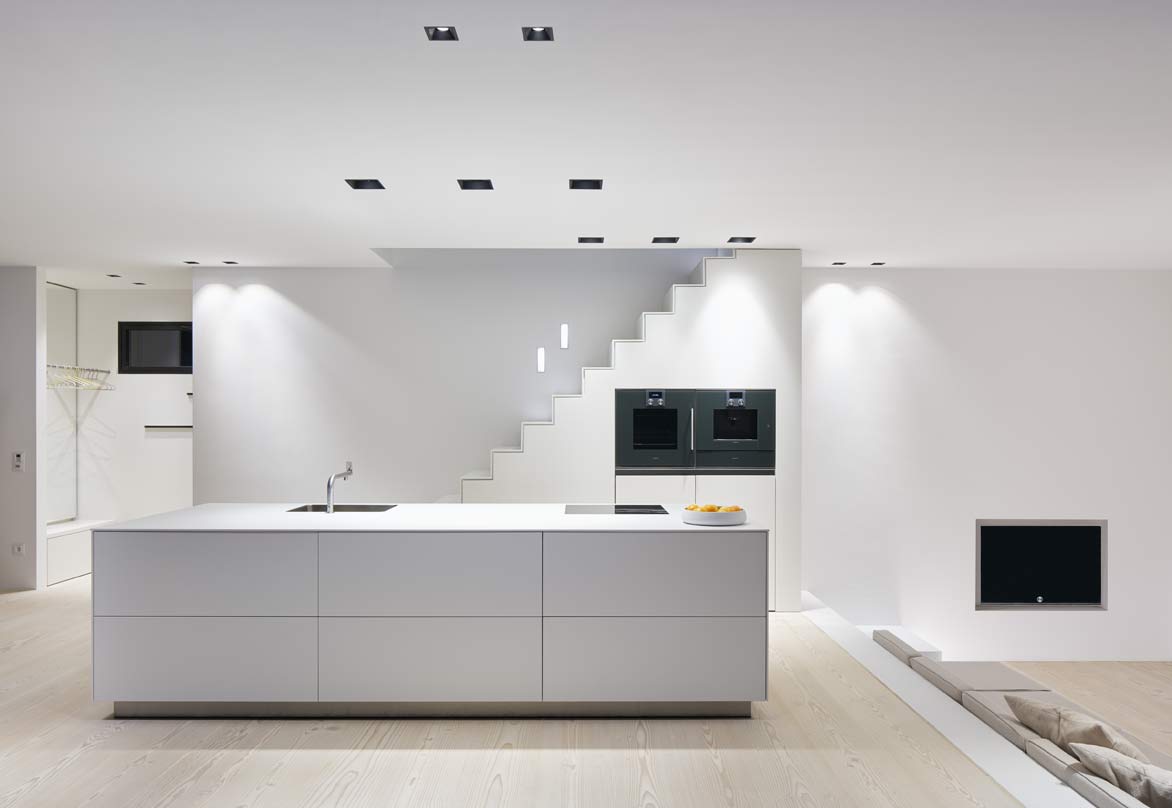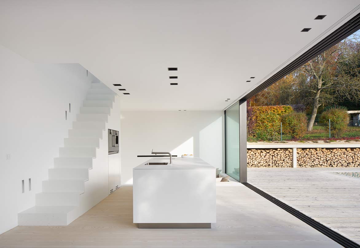 Im Haus selbst sind alle dienenden Funktionen in einer 1,00 m breiten Nebenzone entlang der straßenseitigen Außenwand untergebracht. In die davor stehende Geschosstreppe, die zu zwei Zimmern und dem Bad im Dachgeschoss führt, ist die Küchenzeile integriert. Die Kochstelle steht als Insel frei im Raum.