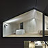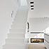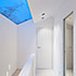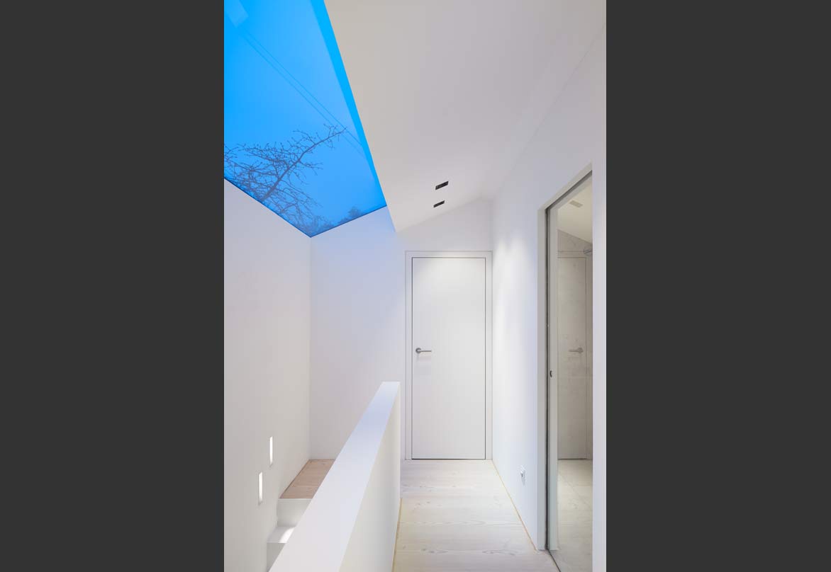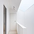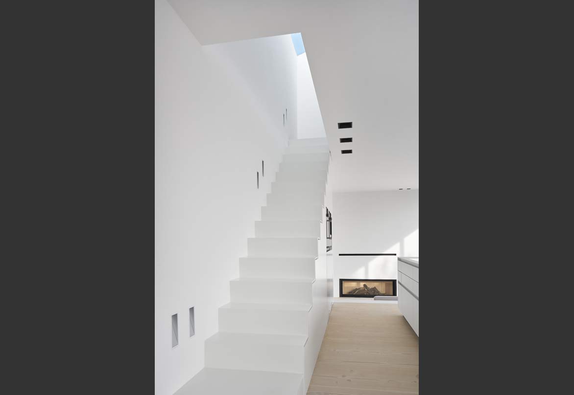 Die Treppe ins Dachgeschoss wird ebenso wie die Durchfahrt durch eine in das Betondach direkt eingeklebte, rahmenlose und außen dachbündige Oberlichtverglasung belichtet. Das Gefühl, es regnet hier ins Gebäude überkommt einen beim darunter Stehen.