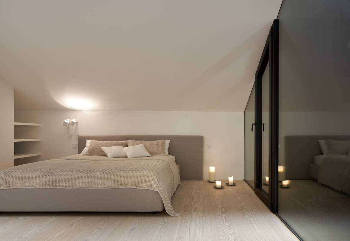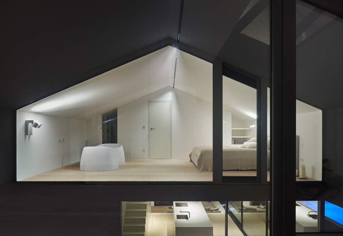 Im Dachgeschoss selbst befinden sich zwei Schlafräume sowie ein wohnliches Bad, wobei die Badewanne wie ein Möbelstück in einem der Zimmer steht.