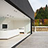 Die breiten, über die gesamte Haustiefe durchgehenden Holzdielen werden durch den Terrassenbelag im Außenbereich weitergeführt. Durch die komplett zu öffnende Glasfassade verschmilzt Innen und Außen.