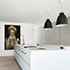 Im Innern besticht der durchlaufende Lärche-Dielenboden, der alle Bereiche zusammenzieht. Feine Möbel, hochwertige Oberflächen stehen in angenehmen Kontrast zu der roh belassenen Sichtbetonwand, die durch's Gebäude führt.