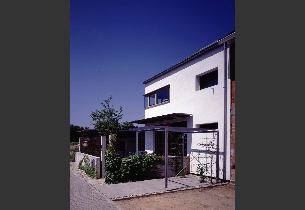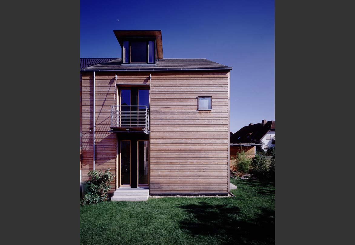 Der Entwurf folgt dem Bebauungsplan, den örtlichen Gegebenheiten des Grundstücks und in erster Linie dem täglichen Sonnenlauf. Als Doppelhaushälfte stehen dem Gebäude drei Fassaden zur Verfügung. Die Süd-Ostseite mit der Erschließung, die Süd-Westseite als freie Giebelfassade und die Nord-Westseite als Gartenfassade. Um passiv die Sonnenenergie zu nutzen, wurde die Erschließungsseite und die Hälfte der Giebelfassade massiv ausgebildet, um Speichermasse zur Verfügung zu stellen. Die zweite Hälfte der Giebelfassade und die Gartenfassade wurde als hochgedämmte Holzkonstruktion ausgebildet, um so wenig aktive Heizenergie als möglich zu verlieren. Die Glasflächen wurden entsprechend eingesetzt.