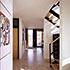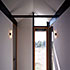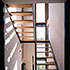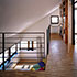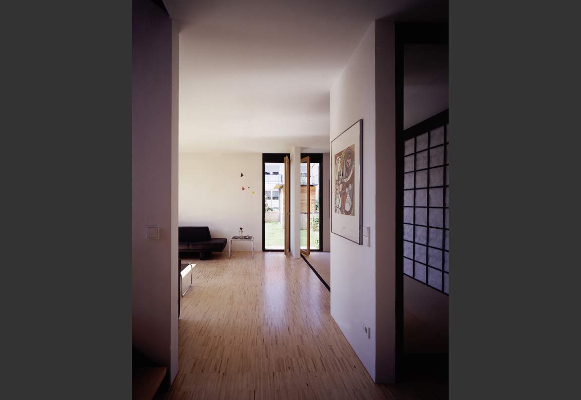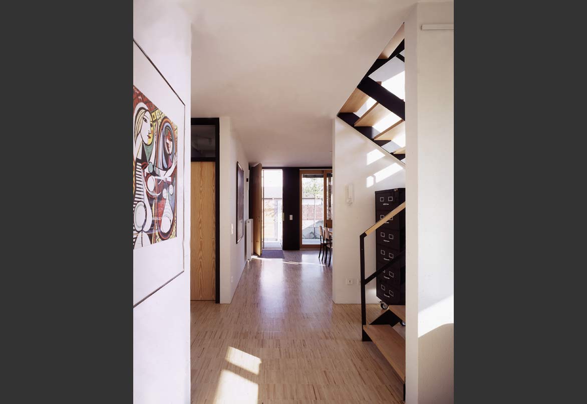 Da das Gebäude quasi ein Endhaus ist, sollte das auch im Grundriss seine Entsprechung finden. So wurden die Aufenthaltsräume jeweils mit quadratischem, also richtungslosen Grundriss, in die Ecken gelegt un dalle mit Fenstern in zwei Richtungen bzw. über Eck versehen. Die Treppe als wichtigstes Bauteil beim Wohnen über drei Geschosse liegt lichtdurchflutet an der freien Giebelwand und stellt die vertikale Trennung zwischen Massiv- und Holzbau auch in der Fassade ablesbar dar. Im Innenraum sind alle Türen mit seitlichen Verglasungen oder Oberlichtverglasungen ausgestattet. Die Treppenwände sind nicht bis an die Außenwand gefäührt, so dass die dahinter liegenden Räume noch früher den erst möglichen Sonnenstrahl über die Treppenverglasung empfangen können. So ist im ganzen Haus, in jedem Raum der Sonnenverlauf den ganzen Tag erlebbar. Sonnenstrahlen werfen ein ständig änderndes Lichtspiel in die Räume. Durchblicke und Ausblicke schaffen auf kleiner Wohnfläche großzügige Wohnatmosphäre. Der helle Treppenbereich erweitert dieses Gefühl ebenso in vertikaler Richtung, wie die Galerie im Obergeschoss hoch ins Dachgeschoss.
