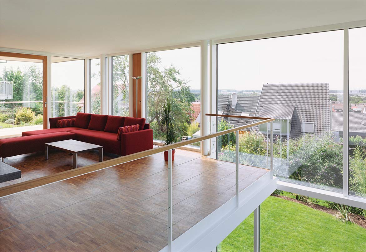 Zur Straße gewandt tritt das Wohnhaus mit seinem Pultdach reduziert und geschlossen auf, in Form und Volumen bescheiden an die umgebende Bebauung angepasst: Eine minimalistische Klärung des traditionellen Hauskörpers. Zur Garten- und Hangseite wird ein Glaskubus angehängt, der die grandiose Aussicht ins Rheintal inszeniert.