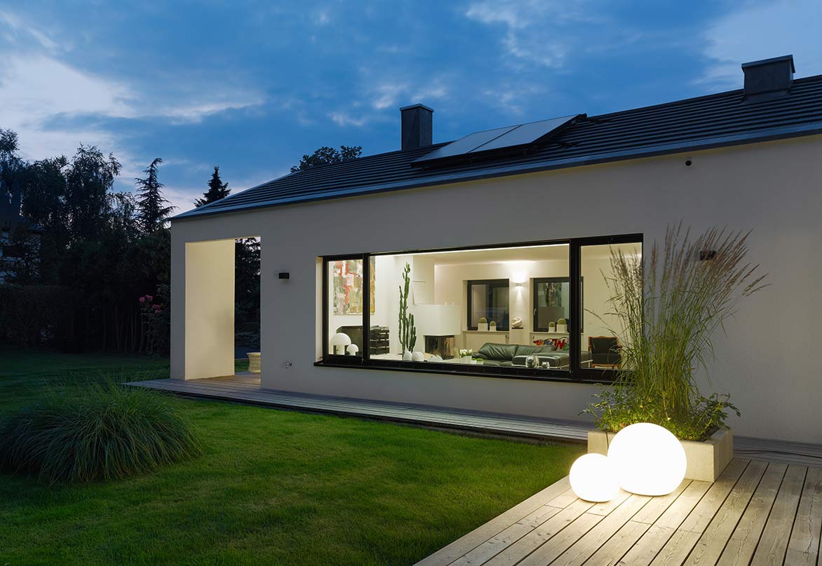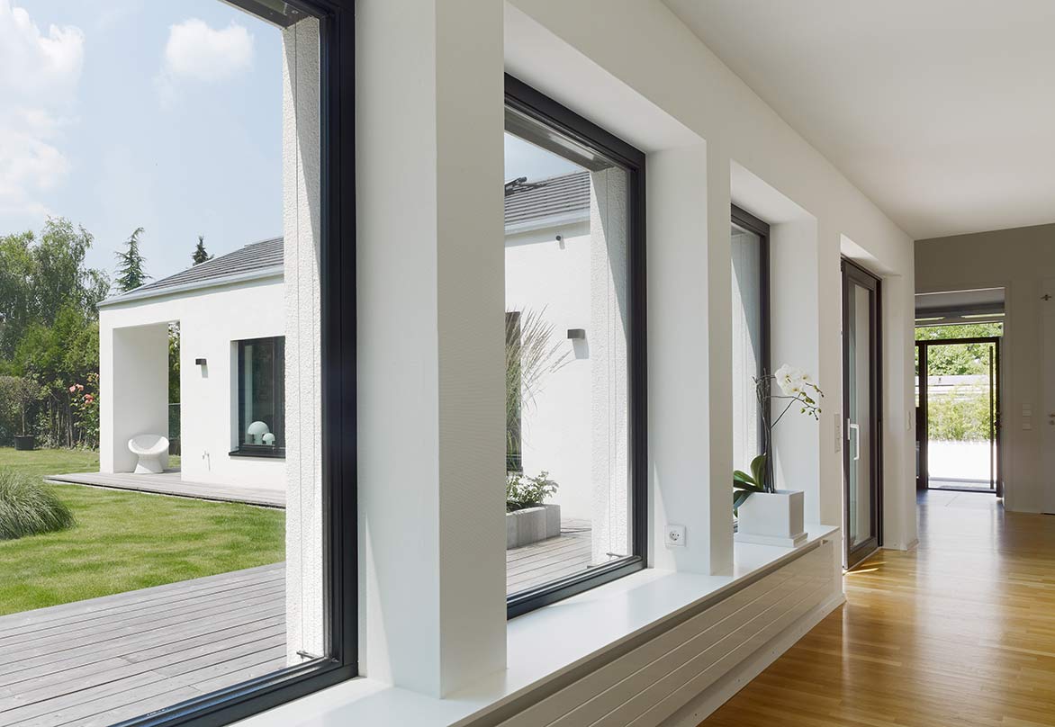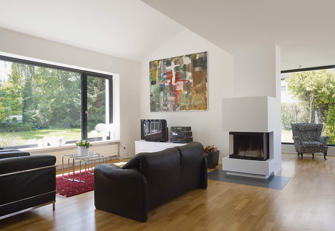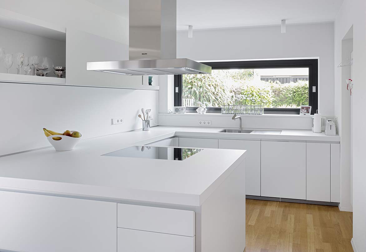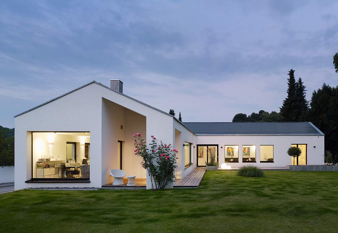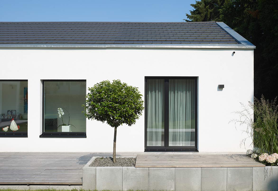 Die Fassaden wurden gedämmt, die Fenster und Rollläden durch 3-fach verglaste Fenster mit Außenjalousien ausgetauscht. An mehreren Stellen wurde der Grundriss an die Bedürfnisse der Bauherren angepasst und dabei natürlich auch die Fassaden weiter geöffnet. Das Haus wirkt nun angenehm hell mit lichtdurchfluteten Räumen und Ausblicken an jedem Punkt.
