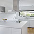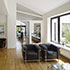 Bei den Böden konnte das bestehende Eiche-Schiffsbodenparkett teilweise erhalten bleiben und mit Neuem ergänzt werden. Durch die angenehme Zurückhaltung mit Farben im Innenraum - alle Wände, Decken, die Küche, Einbaumöbel sind weiß - kommt die eingebrachte, farbenprächtige Kunst verstärkt zum Ausdruck.