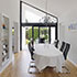 Die abgehängte Decke im Ess-Wohnbereich wurde komplett entfernt, so dass ein schöner, hoher, quer durchbindender Hauptraum entstand. Verstärkt wurde dieser Eindruck durch die nun komplett verglasten Giebelflächen mit durchlaufender Dachschräge auch über die angrenzende Außenterrasse hinaus.