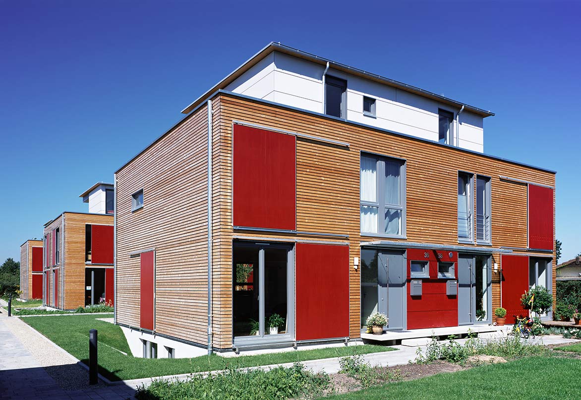 Die Doppelhäuser wurden als Holzbauten ausgeführt, die zu einem großen Teil vorgefertigt wurden und auf der Baustelle nur noch zusammengefügt werden mussten. Einzig der Winkelbungalow und der Carport entstanden in Massivbauweise. Durch den hohen Grad der Vorfertigung und die "serielle" Produktion der Wand- und Deckenteile konnte eine deutliche Kostenersparnis erzielt werden.