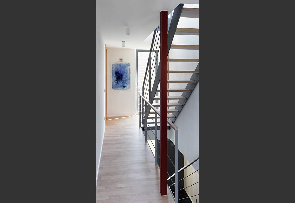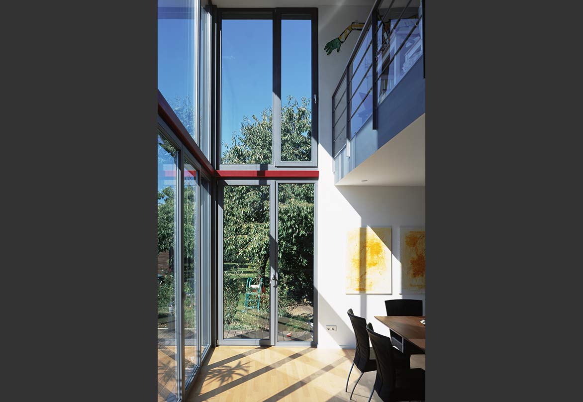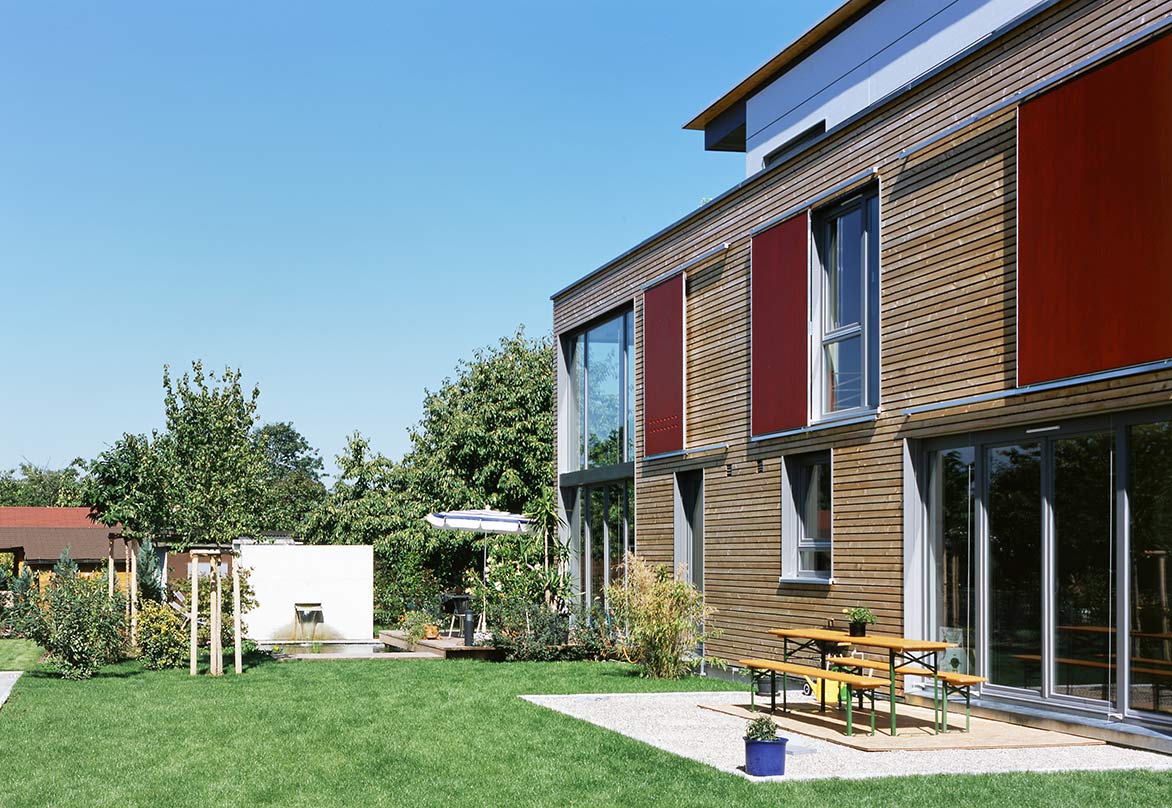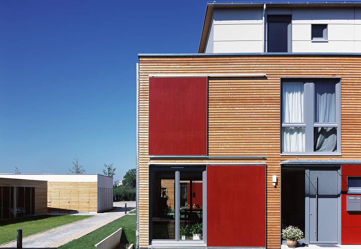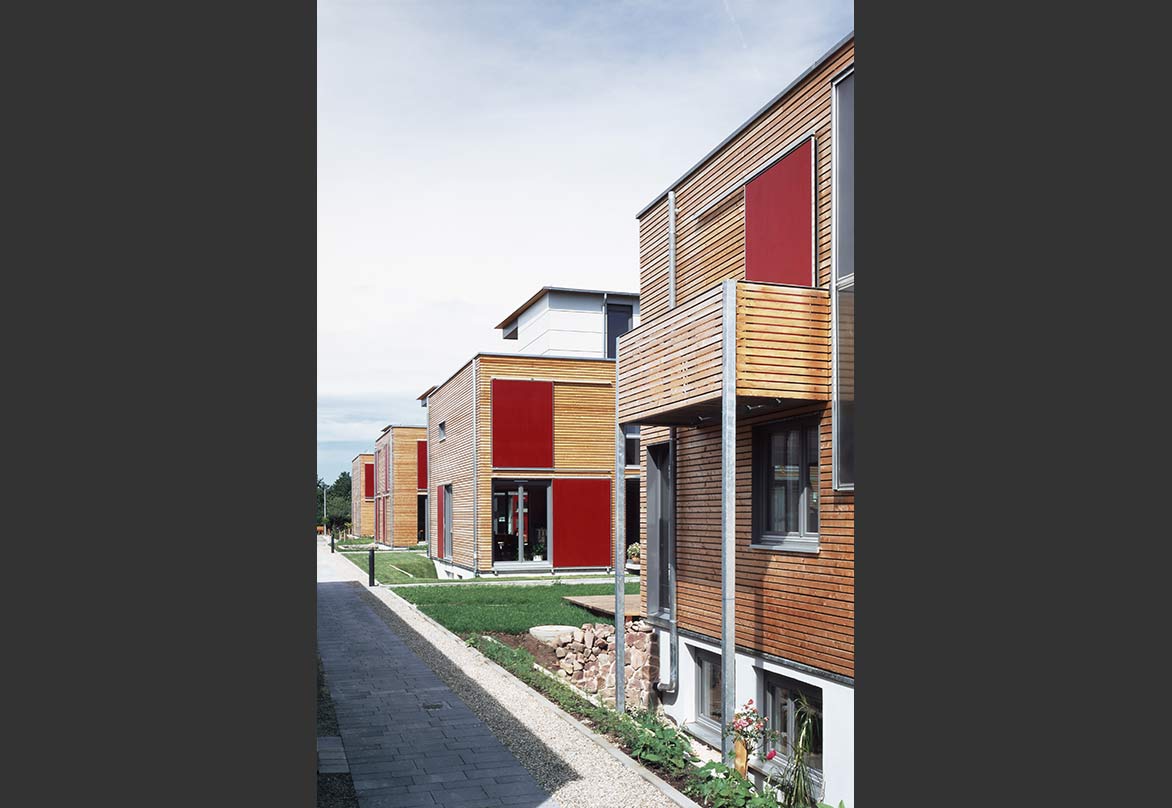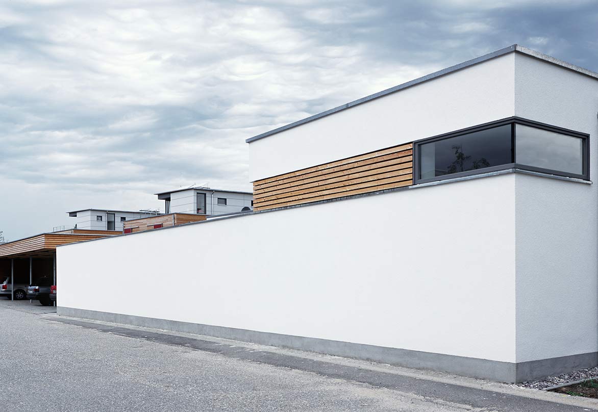 In Zusammenarbeit mit einer Baugruppe entstanden am südlichen Ende des ehemaligen Flugplatzes Neureut 4 Doppelhäuser und ein Winkelbungalow. Die Gebäude bilden eine geschlossene Einheit, die durch einen gemeinschaftlichen Carport für die PKW aller Anwohner von der Straße abgeschirmt ist. Hinter dem Carport, den Gebäuden vorgelagert, entstand so ein kleiner interner Freibereich (zusätzlich zu den Privatgärten jedes einzelnen Hauses), der für gemeinschaftliche Feiern genutzt werden kann.