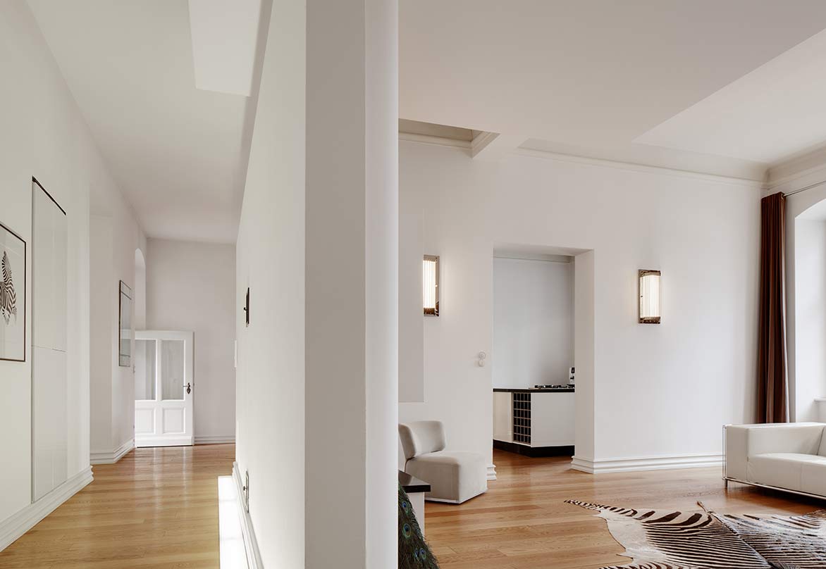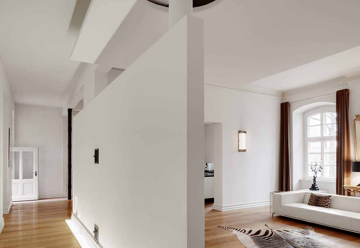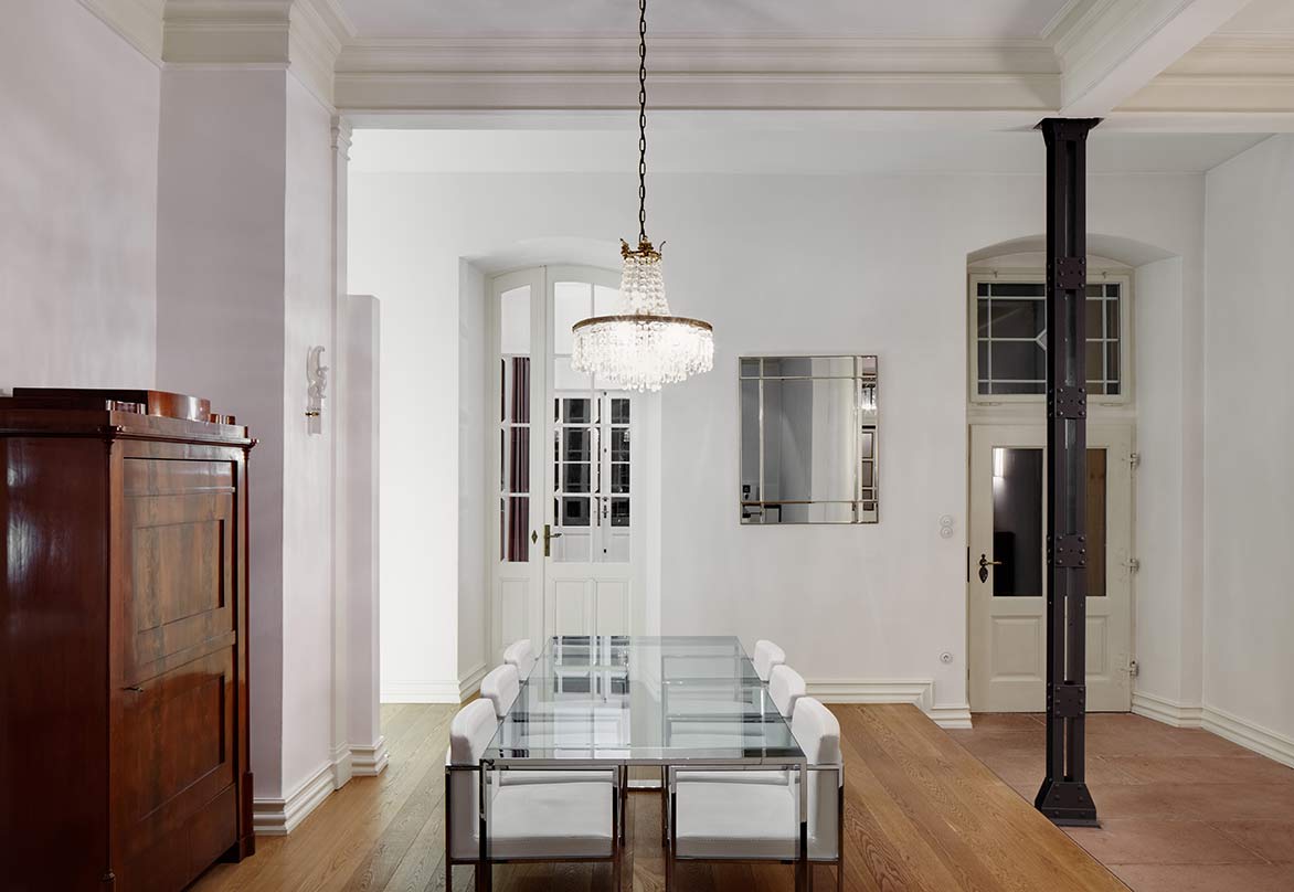 Unsere Aufgabe war es, eine der Wohnungen zu gestalten. Der Wunsch des Bauherren, den Charakter des herrschaftlichen Altbaus in Verbindung mit einem modernen Umbau zu bewahren, kam uns sehr entgegen.