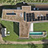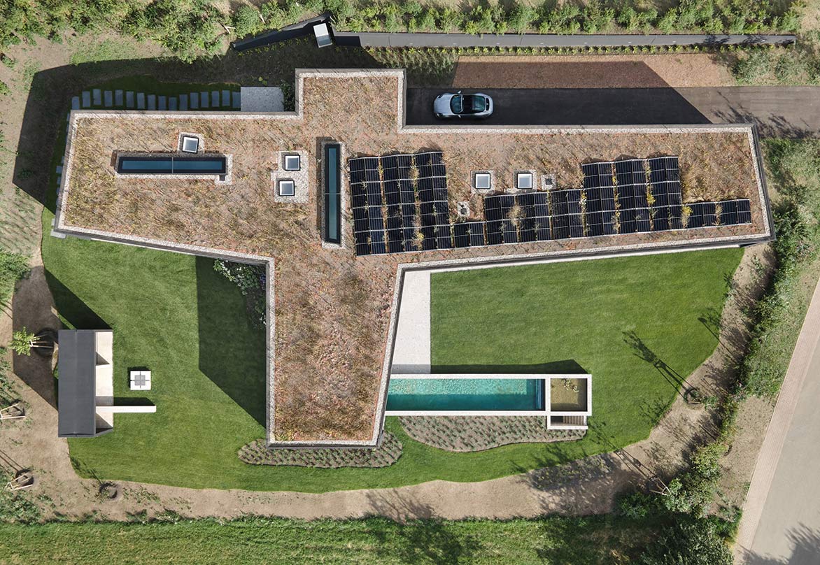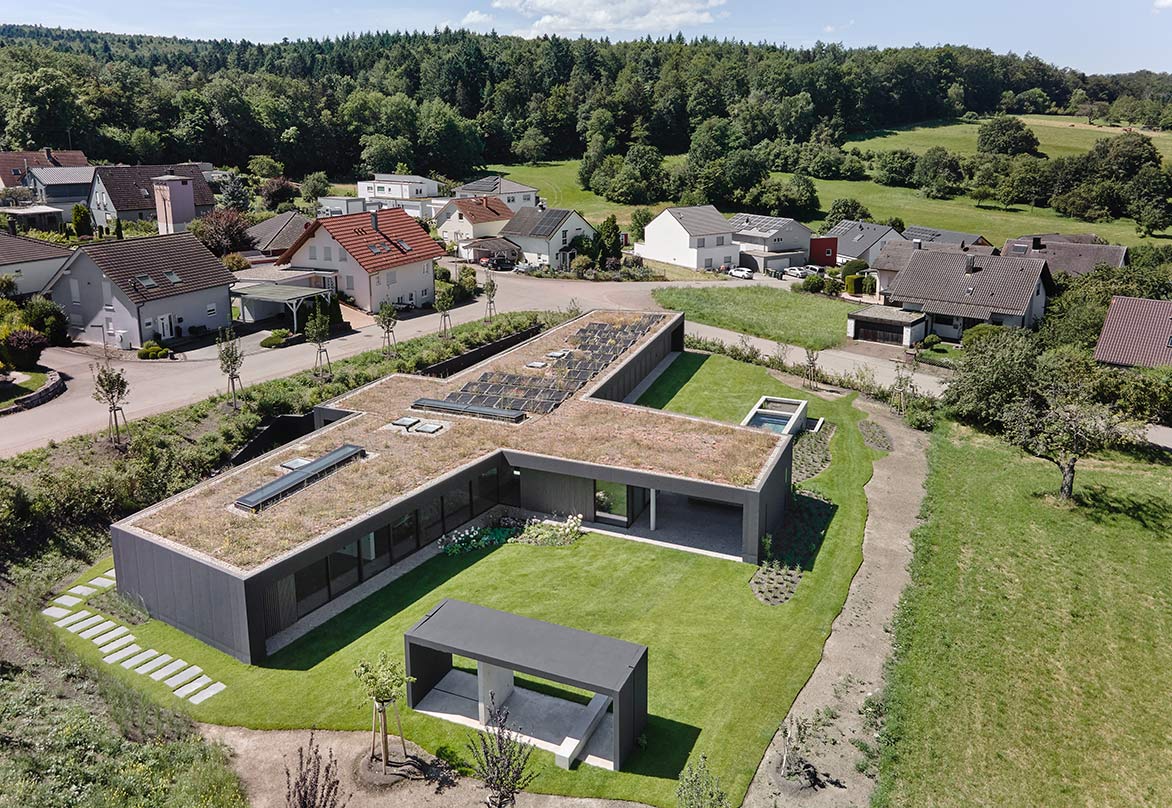 Das Grundstück hat ein Nord-Süd-Gefälle, d. h. die zum Grundstück führende Anliegerstraße liegt oberhalb des Gebäudes und führt bergab zur Grundstückseinfahrt. Dadurch ist die „fünfte Ansicht“, die Dachaufsicht voll einsehbar. Die Dachfläche mit flach darüber aufgeständerter PV-Anlage ist ganzflächig begrünt, im Frühjahr blüht hier eine rote Mohnwiese.