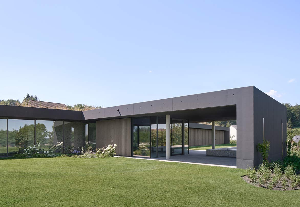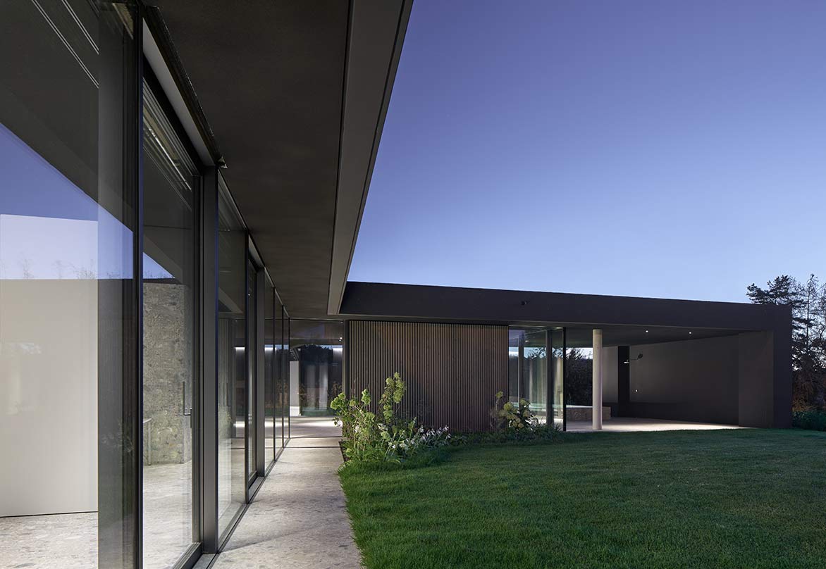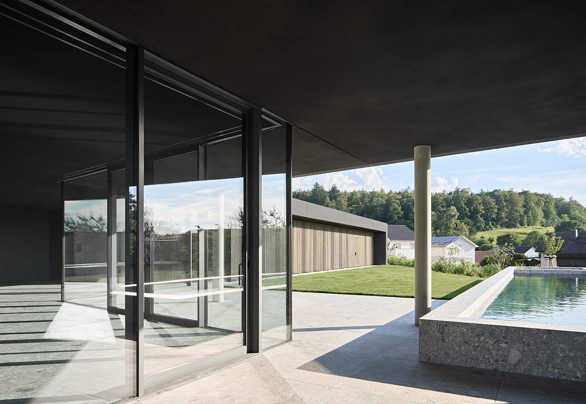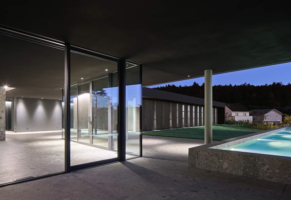 Eingebogen in die Zufahrt, führt eine Holzlamellenwand zum überdachten Hauseingang. Eingetreten eröffnet sich ein Raumkontinuum, das eine unbeschreibliche Klarheit, Homogenität und Ruhe ausstrahlt. Im gesamten Gebäude sind die Böden und Wände mit der gleichen Steinfliese belegt, die schwarzen Akustikdecken wirken immateriell, der Raum verliert seine Begrenzung, man erlebt ein ganz neues Raumgefühl. Tageslicht gleist von oben über Rahmenlose Oberlichtverglasungen über die Wände bis zum Boden. Alle raumhohen Verglasungen sind profilminimiert, das Boden- und Deckenprofil fußboden- bzw. deckenbündig eingelassen. Auf den Terrassen im Außenbereich liegt der gleiche Boden wie innen, auch der Pool hat die gleiche Oberfläche. Die schwarzen Decken fließen wie alle anderen Oberflächen von innen nach außen durch.