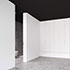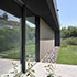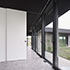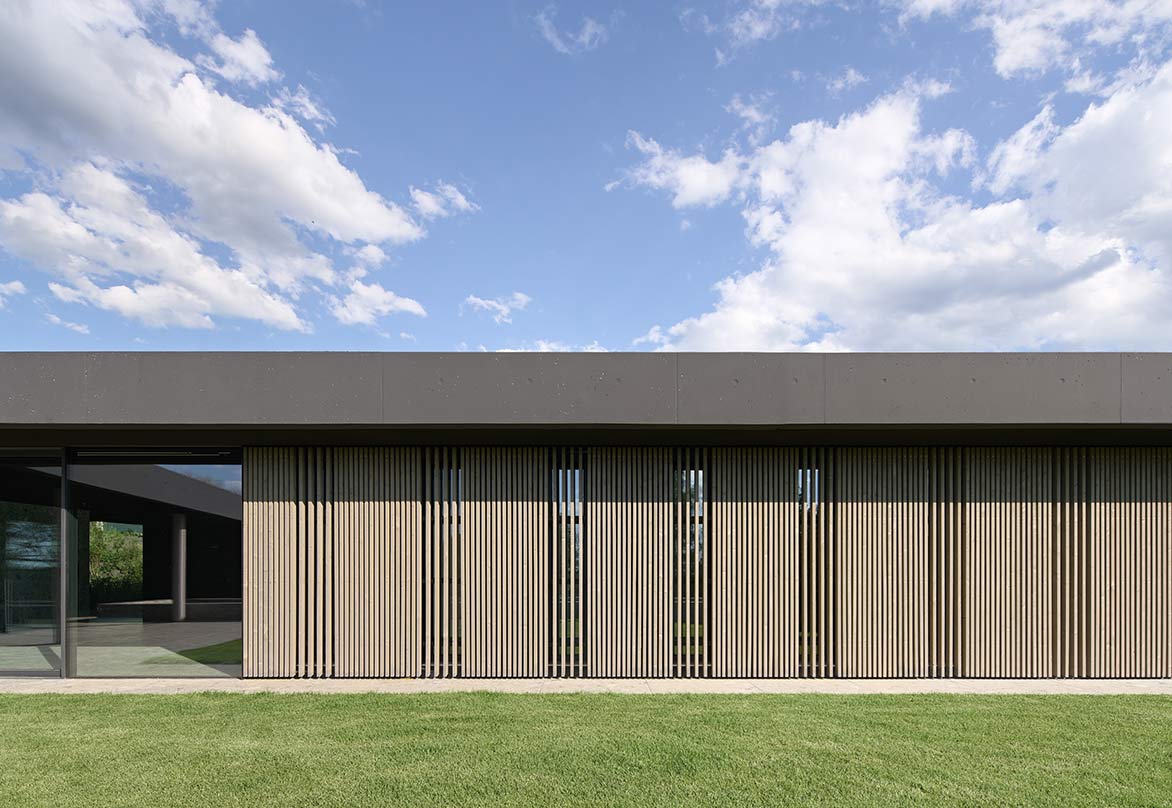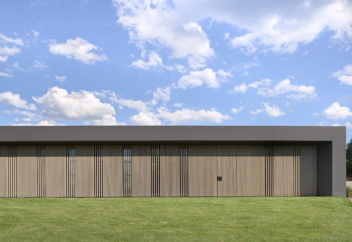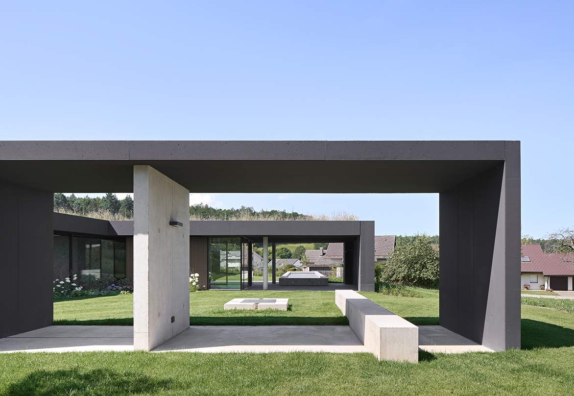 Eingebogen in die Zufahrt, führt eine Holzlamellenwand zum überdachten Hauseingang. Eingetreten eröffnet sich ein Raumkontinuum, das eine unbeschreibliche Klarheit, Homogenität und Ruhe ausstrahlt. Im gesamten Gebäude sind die Böden und Wände mit der gleichen Steinfliese belegt, die schwarzen Akustikdecken wirken immateriell, der Raum verliert seine Begrenzung, man erlebt ein ganz neues Raumgefühl. Tageslicht gleist von oben über Rahmenlose Oberlichtverglasungen über die Wände bis zum Boden. Alle raumhohen Verglasungen sind profilminimiert, das Boden- und Deckenprofil fußboden- bzw. deckenbündig eingelassen. Auf den Terrassen im Außenbereich liegt der gleiche Boden wie innen, auch der Pool hat die gleiche Oberfläche. Die schwarzen Decken fließen wie alle anderen Oberflächen von innen nach außen durch.