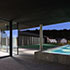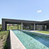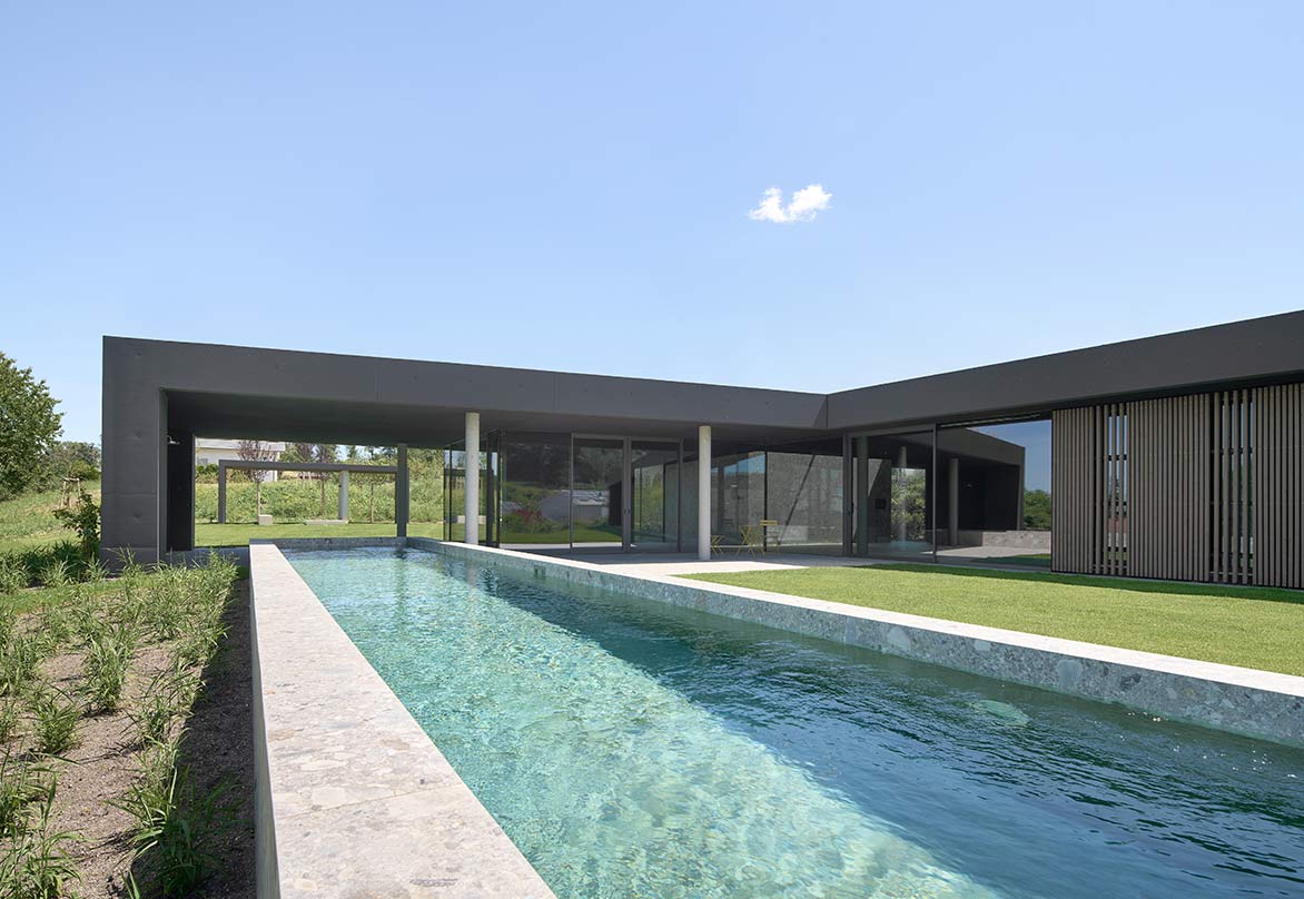 Der Pool aus Sichtbeton sollte zum Schwimmen genutzt werden, also wurde er schmal, aber dafür lang. Er beginnt unter der überdachten Terrasse, schneidet also in die Terrasse ein. Das Becken ist in der Höhe so angeordnet, dass man direkt am Wasser sitzen kann. Durch die Länge des Beckens lässt sich die Topografie des Geländes ablesen.