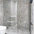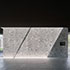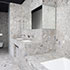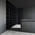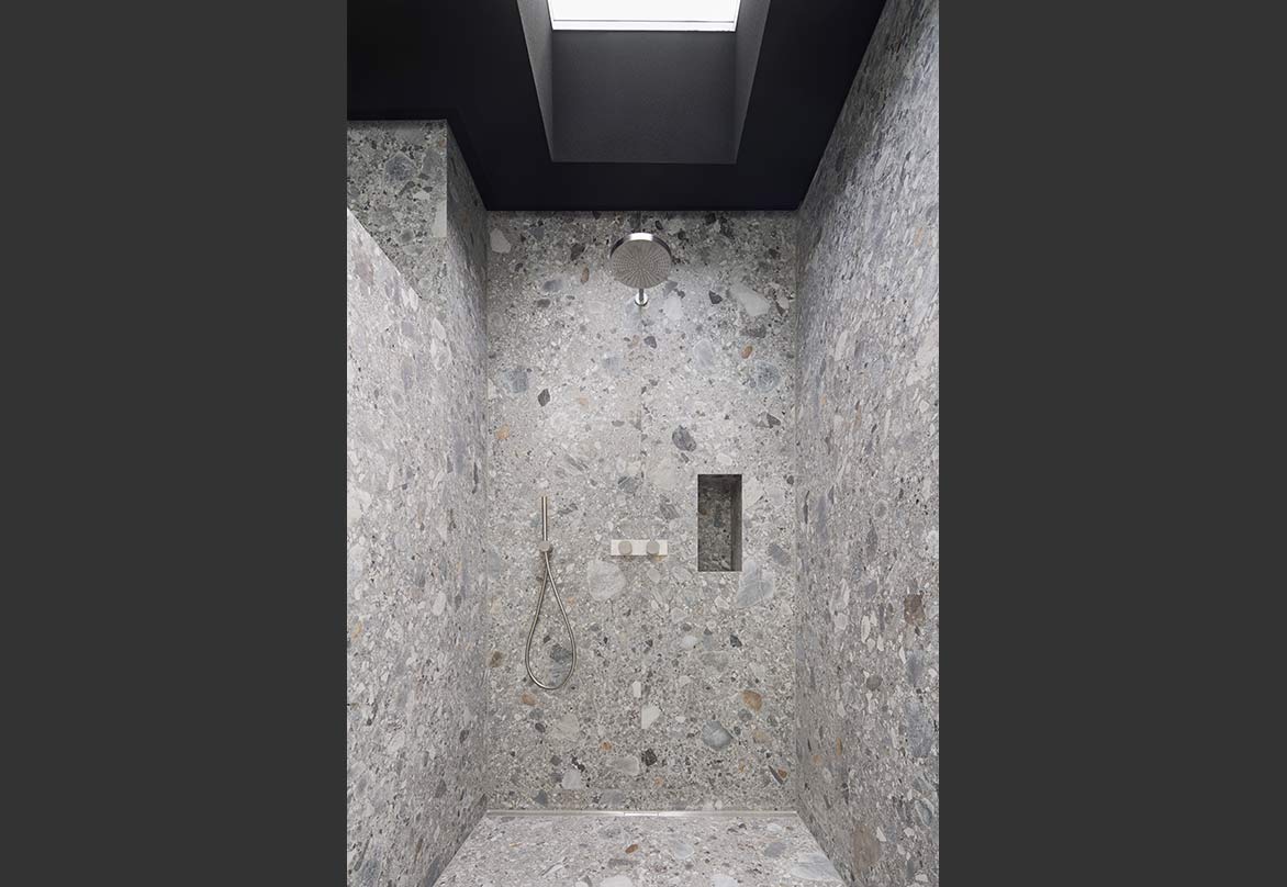 Auch in den Bädern liegt das gleiche Material an Wand und Boden, die Badmöbel sind in die Oberflächen bündig integriert, über das Oberlicht entsteht eine mystische Stimmung.