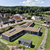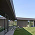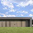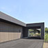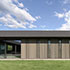 Im Nord-Süd-Gebäudeteil sind die Garagen integriert, sodass es sich zu einer stattlichen Gesamtlänge von 46 m ausdehnt, in Ost-Westrichtung ist der Carport und die überdachte Hauptterrasse integriert. Insgesamt liegen alle Nutzungen innerhalb des Gebäudes. Dafür konnte auf eine Unterkellerung komplett verzichtet werden. Das Bungalowkonzept ermöglicht die barrierefreie Nutzung aller Räume.