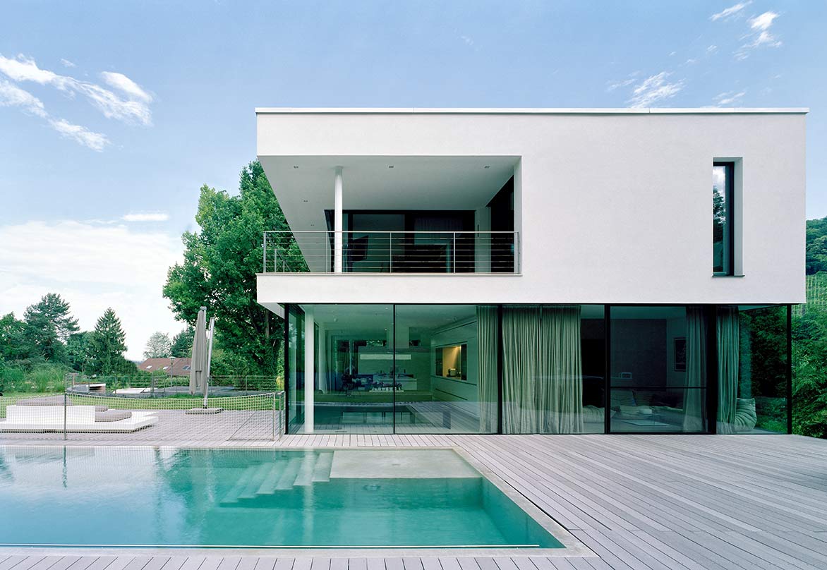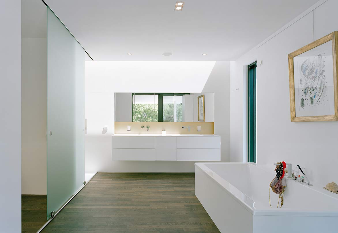 Der engergieoptimierte Betrieb war generell ein wichtiges Kriterium bei der Planung des Wohnhauses. Daher wird das Schwimmbad über die Solaranlage auf dem Dach beheizt. Zur Beheizung des Gebäudes wurde eine Erdwärmepumpe mit Erdsonden eingebaut. Eine kontrollierte Wohnraumlüftung mit Wärmerückgewinnung sorgt für das behagliche Raumklima in dem hochgradig wärmegedämmten Baukörper.