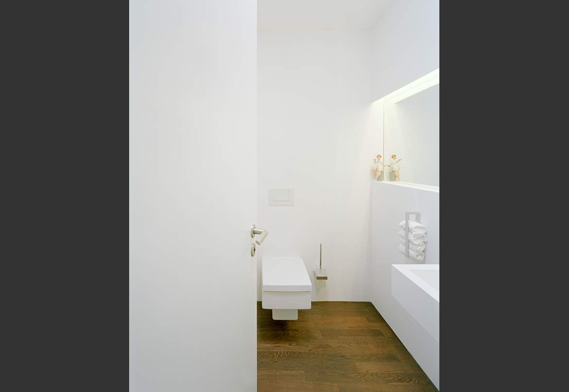 Im oberen Geschoss befinden sich die Schlafräume und Bäder der Familie. Die Bereiche bieten Rückzugsmöglichkeiten, hier wurde viel Wert auf Privatheit und Schallschutz gelegt. Die Schlafräume der Eltern und Kinder liegen räumlich getrennt voneinander, jeder Raum hat seine eigene Loggia, zudem haben Eltern und Kinder jeweils eigene Bäder.