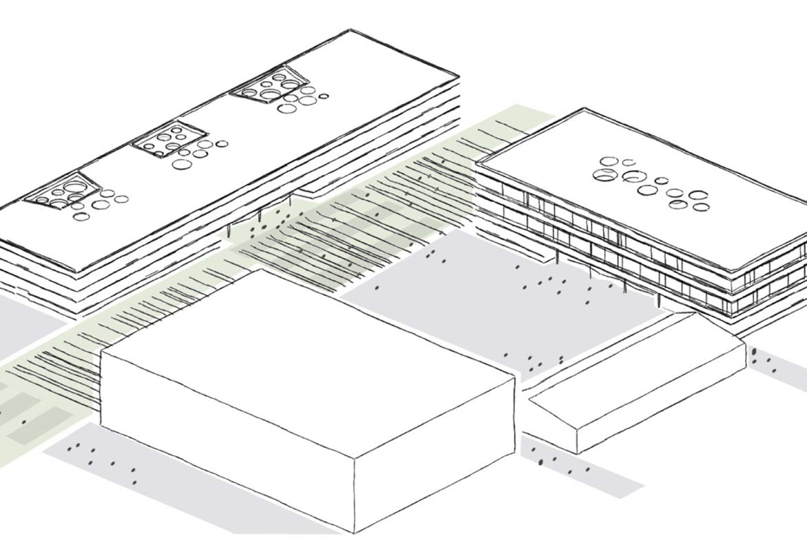 Der Verfasser schlägt zwei Gebäude vor, die sich an dem nord-süd verlaufenden sogenannten „Aktivband“ angegliedert, welches die verschiedenen vorhandenen Schulhöfe miteinander verbindet und Richtung Süden fortführt. Die vorgeschlagenen Bauten werden sensibel in das Gebäudegefüge platziert und nehmen die vorhandenen Gebäudekanten der umliegenden Schulgebäude konsequent auf.