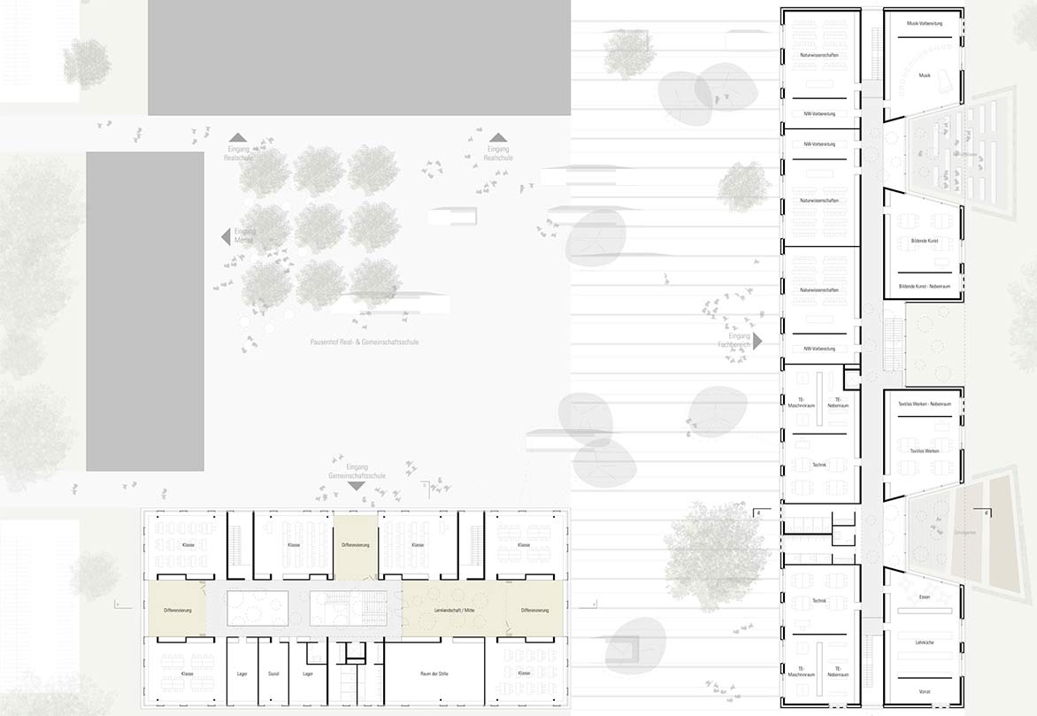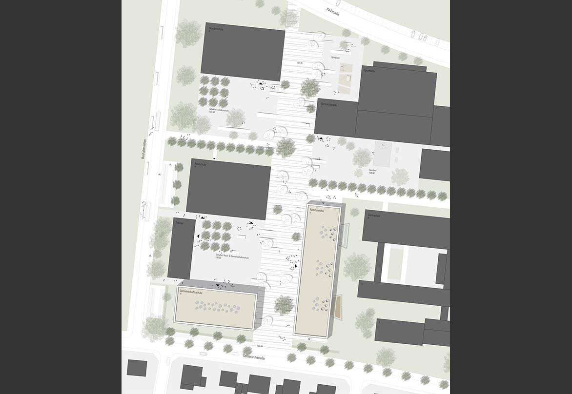 Die momentan unübersichtliche Situation auf dem Campus wird neu geordnet. Die Fluchten der unterschiedlichen Bestandsschulen werden aufgenommen und durch die neue Gemeinschaftsschule (GMS) gefasst. Es werden für jede Schule großzügige, wohlproportionierte Pausenhöfe ausgebildet und kleinteilige Restflächen vermieden.