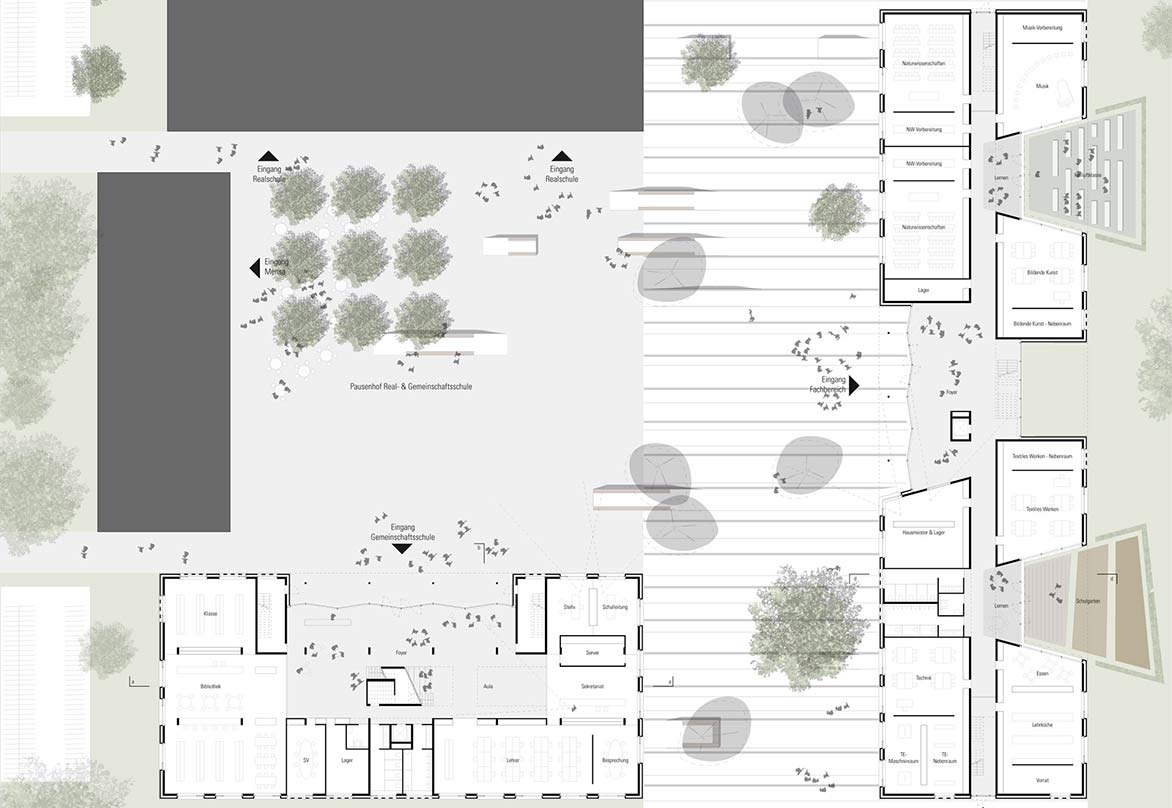 Alte Baukörper (Realschule, Mensa) und neue (GMS, Fachbereich) bilden ein eng zusammenhängendes Ensemble. Es entsteht ein klar gefasstes Inneres mit dem Pausenhof zwischen den Gebäuden und ein Äußeres mit den Grünflächen um die Schule herum. Im Inneren, dem Pausenhof, gibt es Raum zum Veranstalten, Versammeln und ein Blätterdach mit Sitzgruppen für die Mensa. Der äußere Bereich ist geprägt von großzügigen Grünflächen mit Baumreihen und Schülergärten, wo gepflanzt, geerntet, gelernt und gewerkelt werden kann.