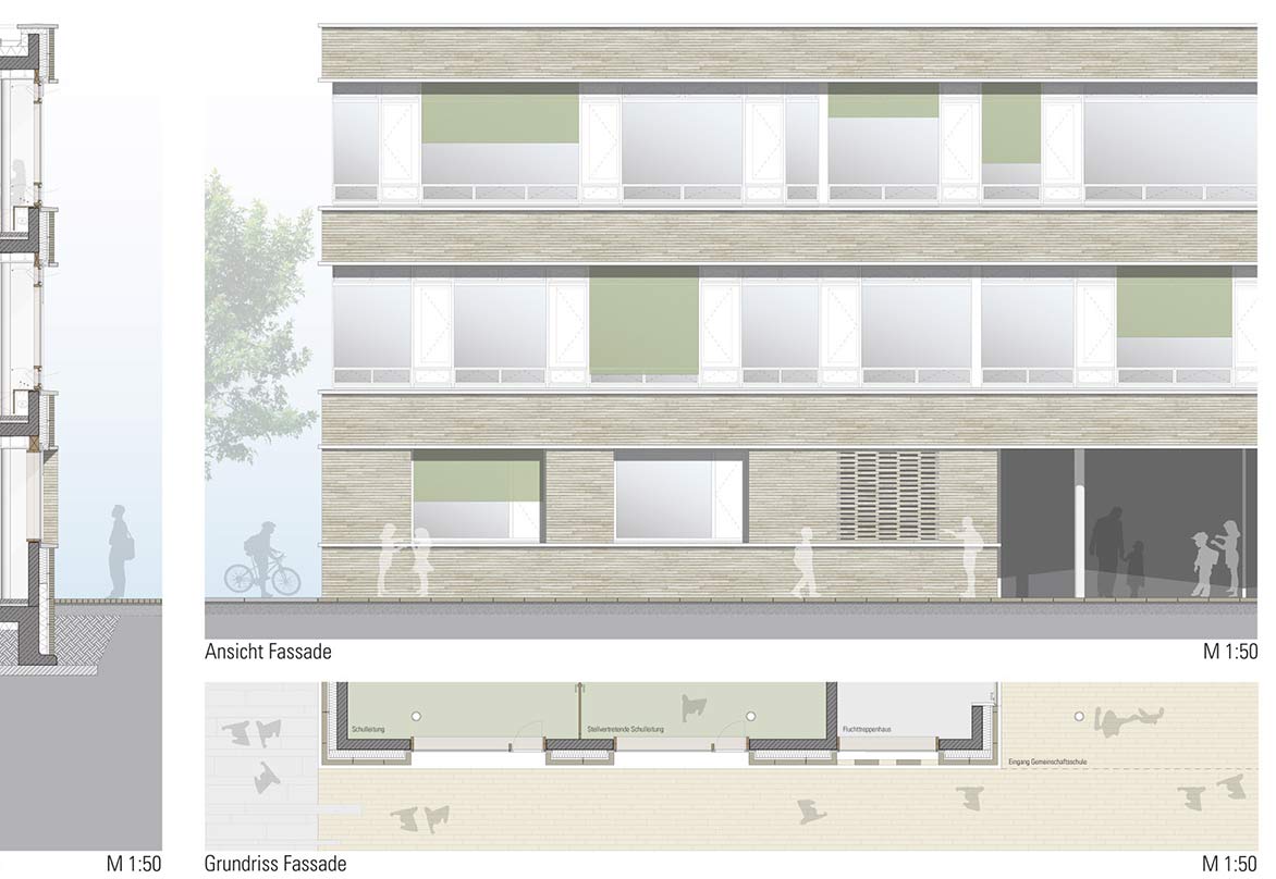 Realschule, Mensa, Gemeinschaftsschule und Fachbereich gruppieren sich um den Pausenhof, an welchen die Eingänge der Schulgebäude anschließen. Die Glasfassade des Foyers liegt in der Gebäudehülle zurückversetzt und bildet eine klare, überdachte Eingangssituation.