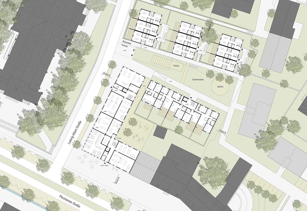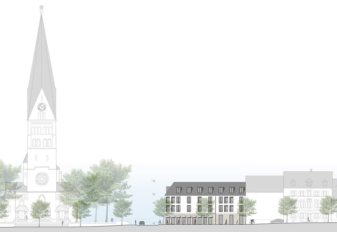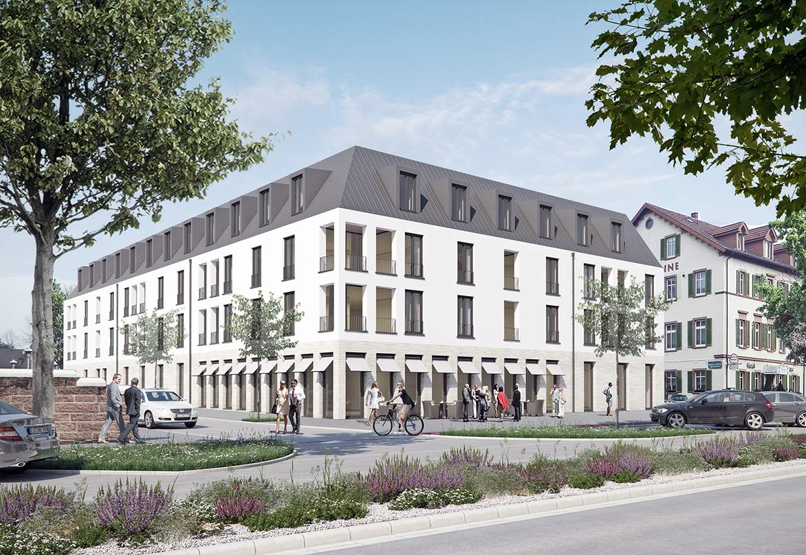 Die vorhandene Häuserzeile entlang der Pforzheimer Straße wird Richtung Herz-Jesu-Kirche vervollständigt und in die Ludwig-Albert-Straße hineingeführt. Hierbei wird bewusst nicht entlang der Grundstücksgrenze geplant, sondern in gerader Verlängerung des Hotels Sonne. Dies stellt in erster Linie das prächtige Portal der Herz-Jesu-Kirche besser frei und verbreitert zudem den Fußgängerbereich vor den Gewerbeflächen, sodass eine großzügige Außenbestuhlung ermöglicht wird.