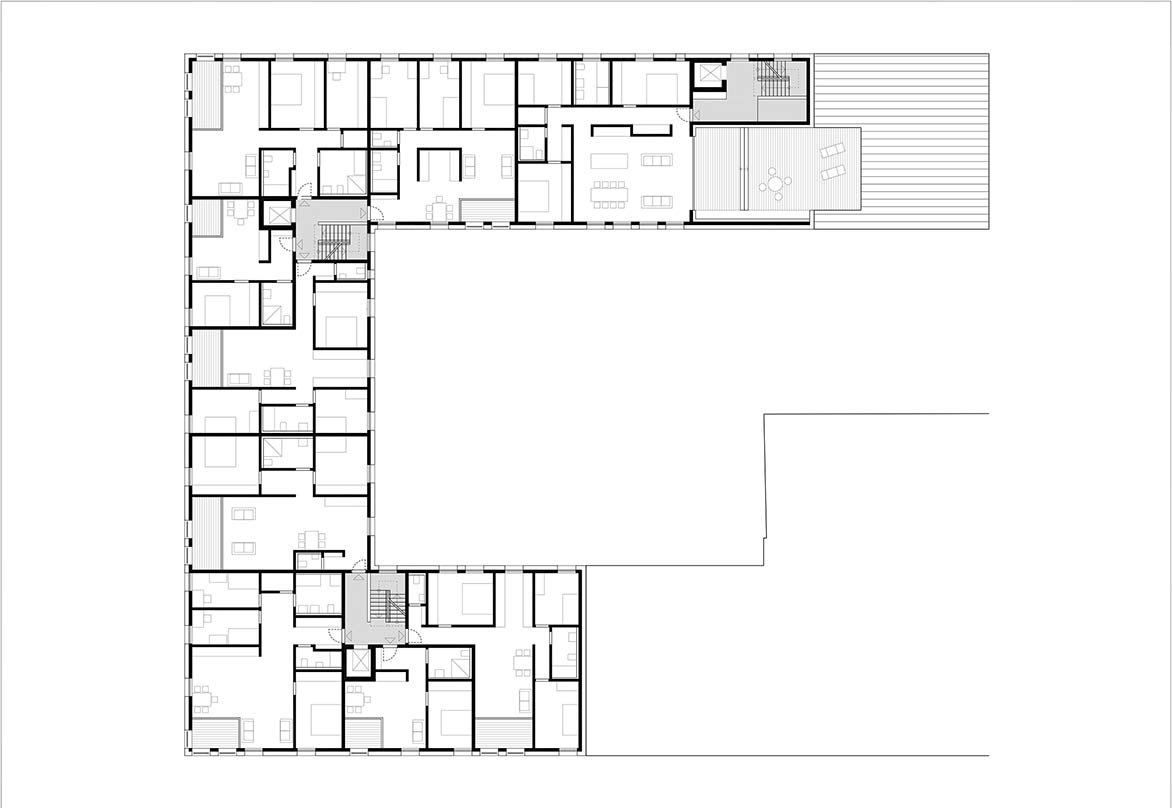Das Gebäude orientiert sich in Maßstäblichkeit, Materialität und den gestaltgebenden Details an der umliegenden Bebauung. Eine dreigeschossige Fassade, gegliedert in eine robuste Sockelzone und eine darüber liegende hell verputzte, zweigeschossige Lochfassade vermittelt in Verbindung mit einem klassisch geneigten Metalldach ein vertrautes Bild. Im Detail wird dieser Eindruck vertieft, ohne historisierend zu werden. Scharf geschnittene Kanten, präzises Mauerwerk, geglätteter Putz, moderne, aber zurückhaltende Gauben sind wesentliche Gestaltungsmerkmale die sich in Verbindung mit den reihenden, stehenden Fensterformaten und Gauben wie selbstverständlich ergänzen. Die Loggien, der bei genauer Betrachtung leicht variierende Fensterabstand sowie die gezielte Anordnung der Dachentwässerung parzellieren das kräftige Gebäudevolumen wieder in gewohnte Einheiten, wenngleich die mächtige Kirche in der Nachbarschaft einen Gesamtbaustein in der geplanten Größe gut verträgt.