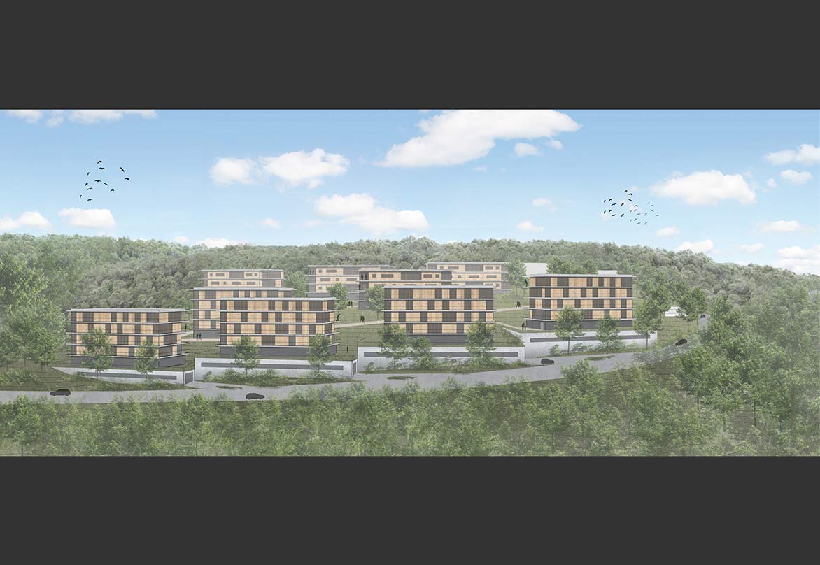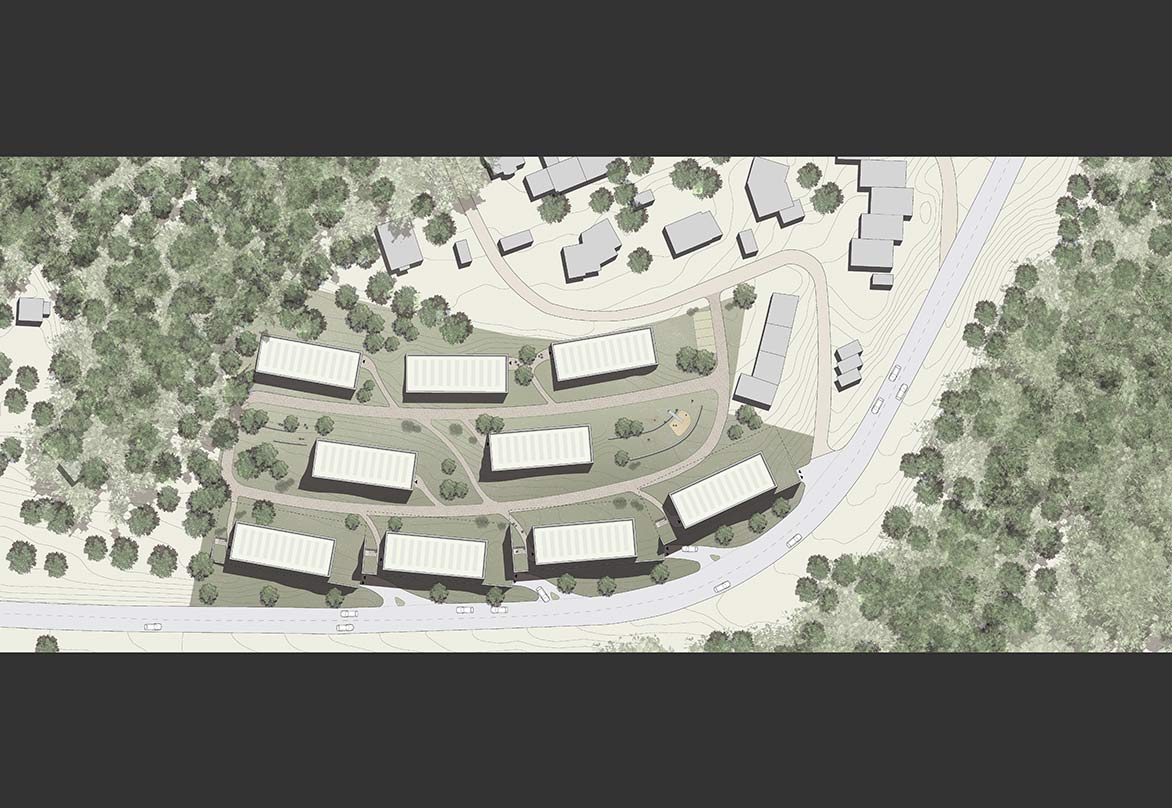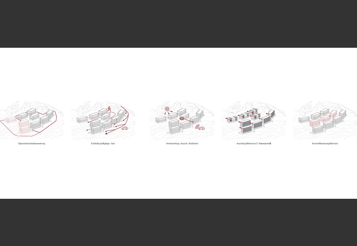 Unser städtebauliches Konzept basiert auf dem minimalen Eingriff in den Felsuntergrund und in die Respektierung der Hangsituation. Wir erreichen dies, indem wir unsere Bebauung parallel zu den Höhenlinien anlegen, Einzelbaukörper anbieten, die den Richtungswechseln der Höhenlinien leicht folgen können und die Gebäude nicht unterkellern.