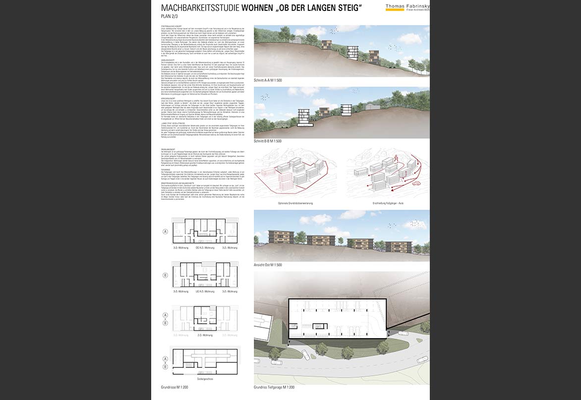 Die Gebäude reagieren, trotz auf den ersten Blick ähnlicher Gestaltung, mit Ihren Grundrissen und Hauptwohnseiten auf die speziellen Gegebenheiten. So sind die vier Gebäude entlang der „Langen Steig" als reine Nord-Süd-Typen konzipiert, deren Wohnseiten hangaufwärts nach Süden ausgerichtet und zur lauten Straße nur Erschließung und Nebenräume, also keine Aufenthaltsräume angeordnet sind.