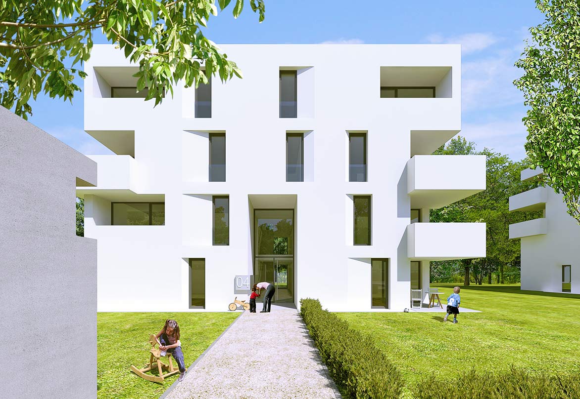 Die bestehende Wohnanlage zeichnet sich zudem dadurch aus, dass es nur einen Haustyp gibt, der lediglich in der Gebäudelage variiert wird. Dieser klaren Struktur begegnen wir mit der ebenso klaren Maßnahme, lediglich einen "Baustein" hinzuzufügen, um so die ruhige Ausstrahlung des Wohngebiets zu unterstreichen.